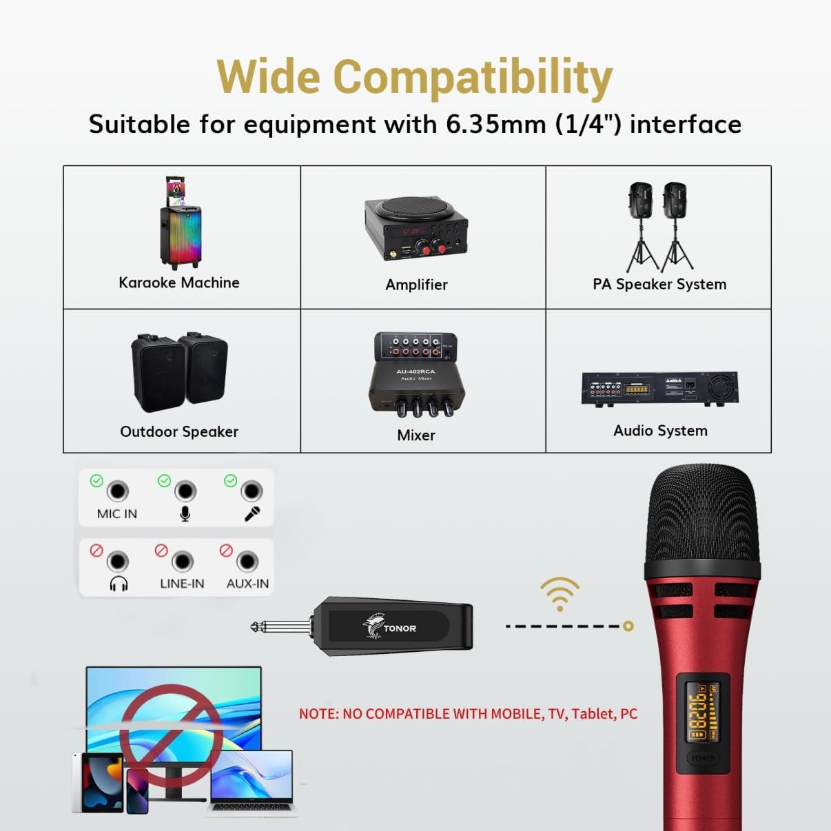 Plug& Play: The 6.35mm Jack receiver makes it suitable for devices with 6.35mm audio interface like karaoke machines, speakers, amplifiers, mixers. Note: this system is not compatible with TV, mobile phones, computers or tablets