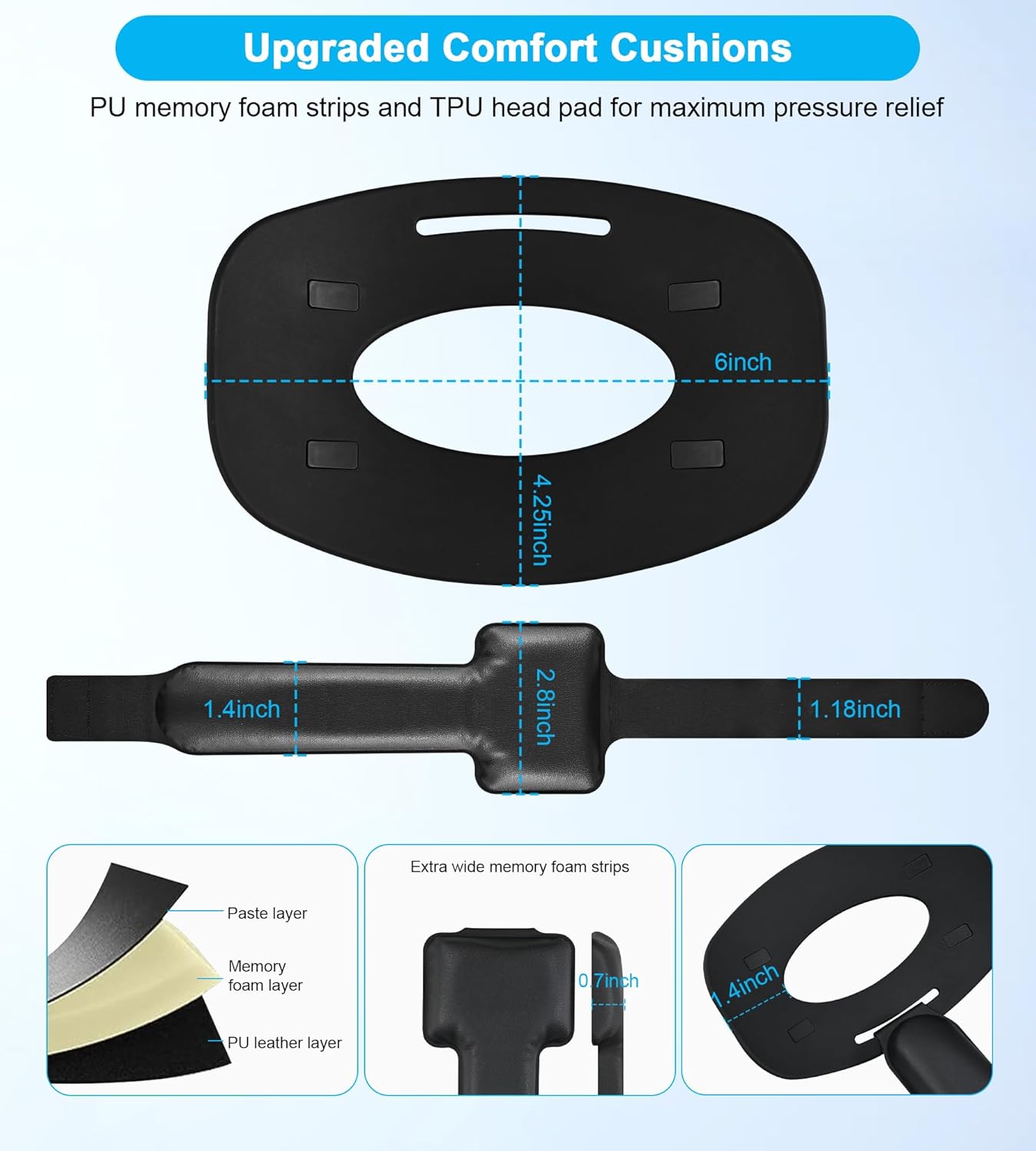 【Premium PU Leather Cushions】Equipped with skin-friendly PU leather pads at each support point, the upgraded head pad is more soft, breathable and absorbent, which can relieve the heat in the back of the head when playing games. The high-grade comfortable PU leather cushion with a smooth surface is very easy to clean, just wipe with a damp cloth, no any maintenance worries.