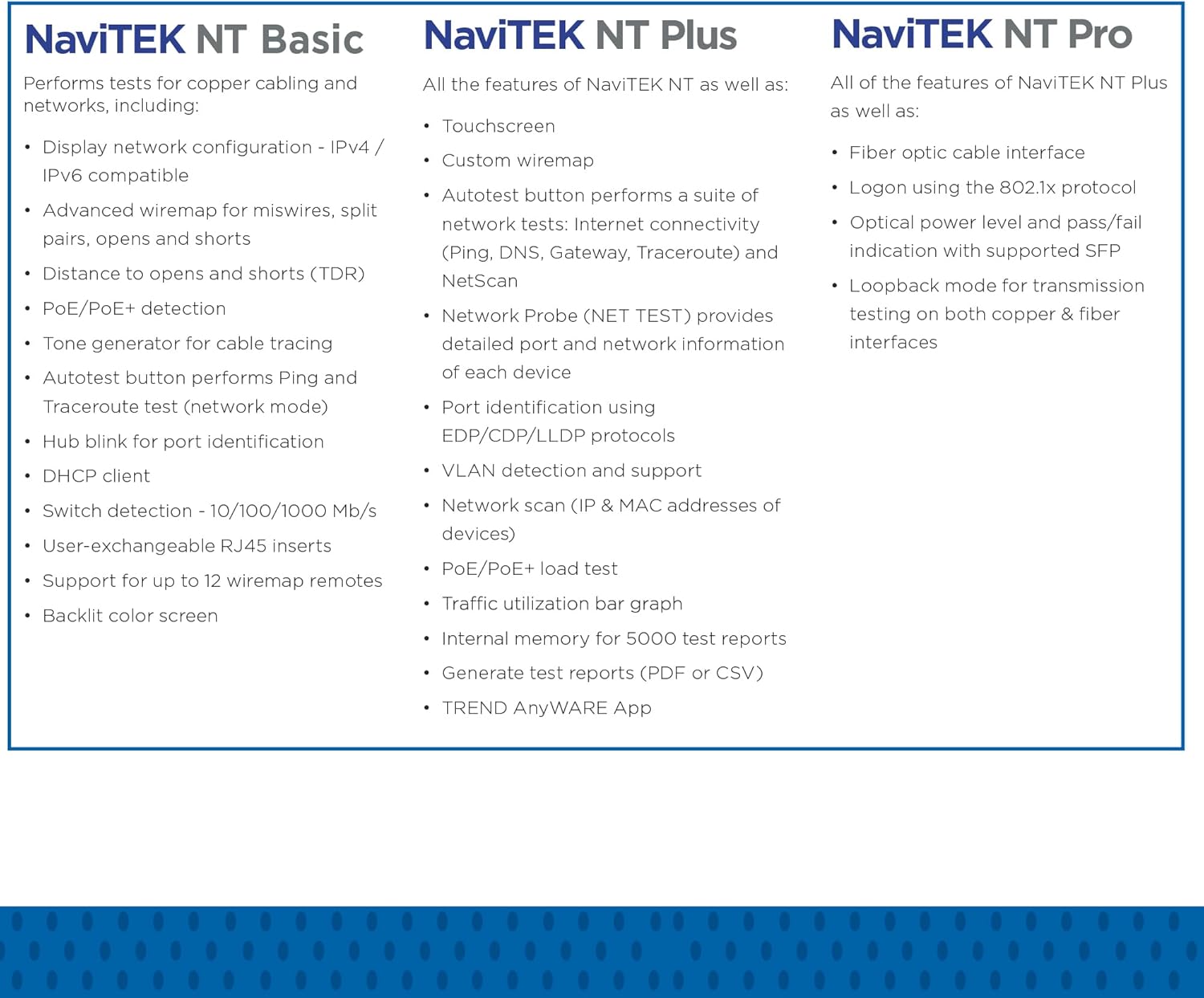 NAVITEK NT: The NaviTEK NT PLUS offers a comprehensive suite of test and troubleshooting functionality for copper networks, allowing network technicians to pinpoint and solve network connectivity issues faster than ever before. Send test reports from your mobile device using the free IDEAL AnyWARE app. Generate test reports (PDF or CSV)