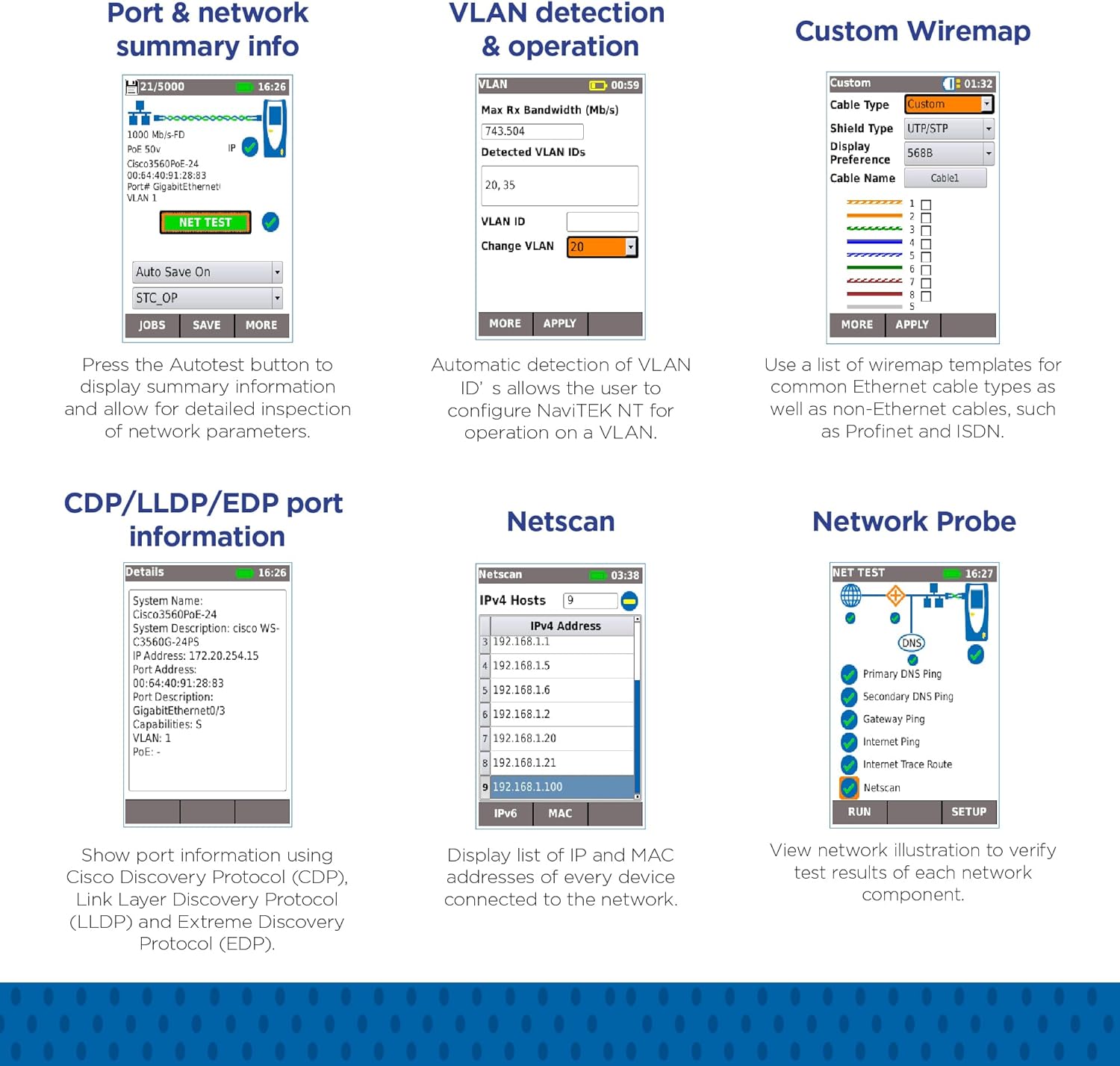 FEATURES: See a given network at a push of a button with the NaviTEK NT PLUS. The device displays detail network parameters including PoE/PoE+ load testing, CDP/LLDP/EDP port information, and VLAN detection and operation