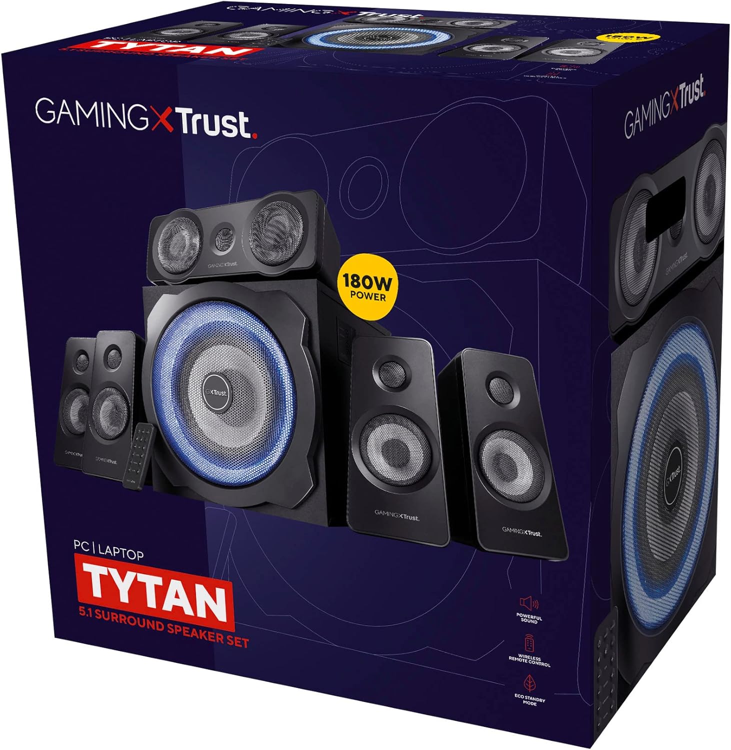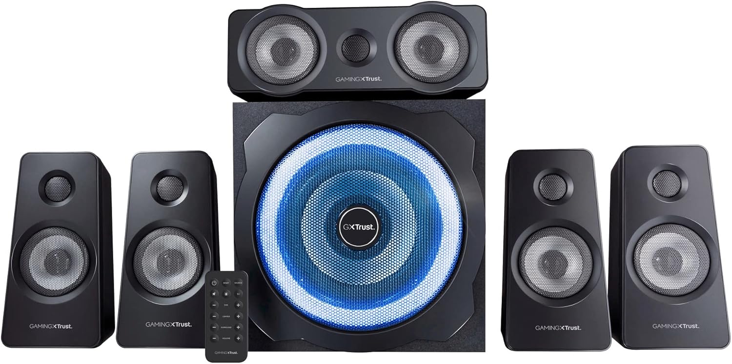 6 reviews for Trust Gaming GXT 658 Tytan 5.1 Surround Sound Speaker System, PC Speakers with Subwoofer, UK Plug, LED Illuminated, 180 W – Black/Blue