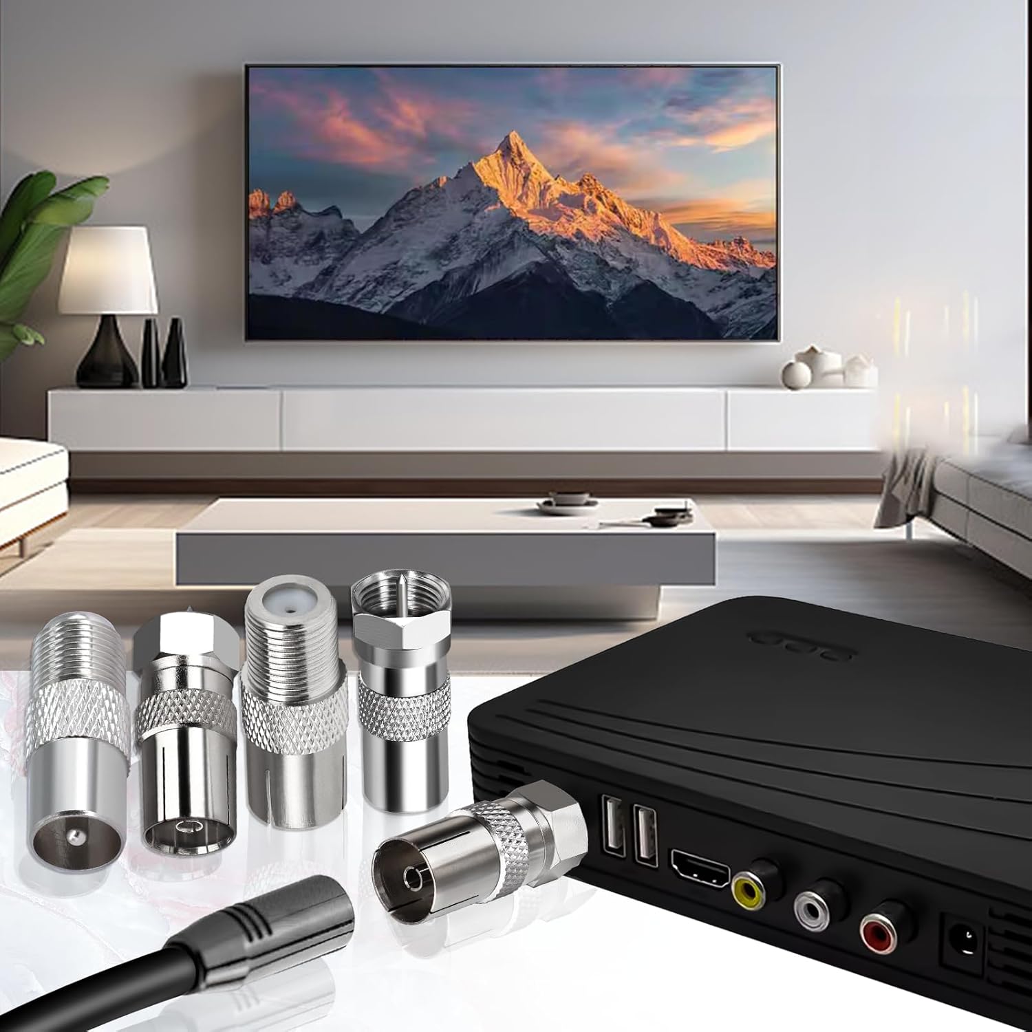 Package Includes: You will get 4pcs of F to TV adapter kit: 1pc of F Male to TV Male aerial adapter, 1pc of F Male to TV Female aerial adapter, 1pc of F Female to TV Male aerial adapter, 1pc of F Female to TV Female aerial adapter