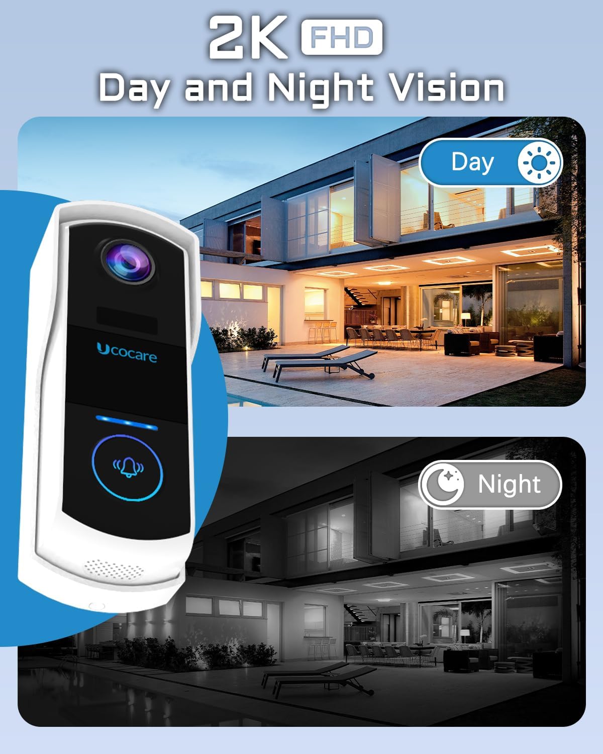 UCOCARE Doorbell Camera Wireless with Chime, 2K FHD Video Doorbell Wireless, PIR Motion Detection, Instant Alerts, 2-Way Audio, Night Vision, 2.4G WiFi, IP67, Battery Powered(Black)