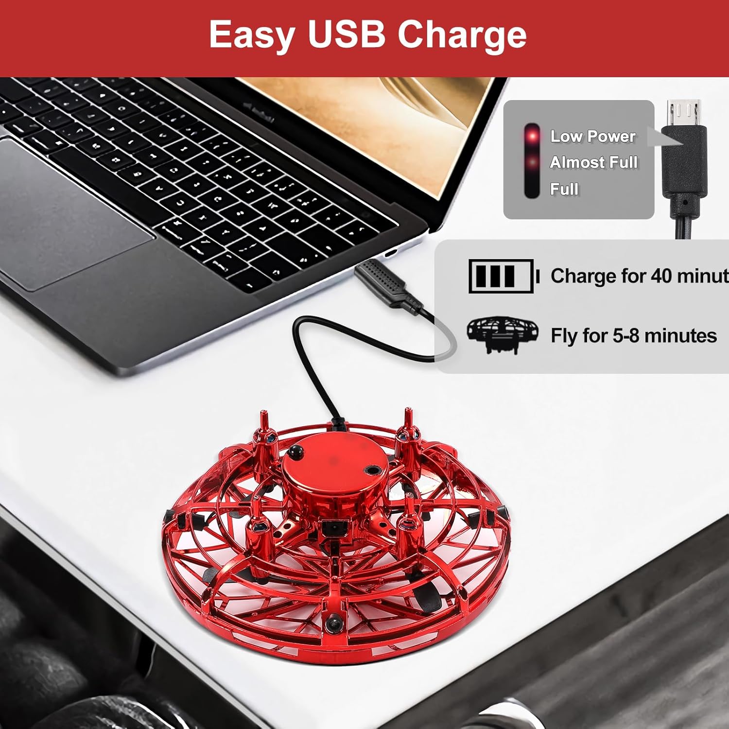 Versatile rechargeable via USB: Enjoy convenient charging via USB, which enables a full charge in just 40 minutes. This gives you an exciting 8 minutes of uninterrupted flying fun. The LED indicator lets you know when you need to recharge the drone. The fun never stops!