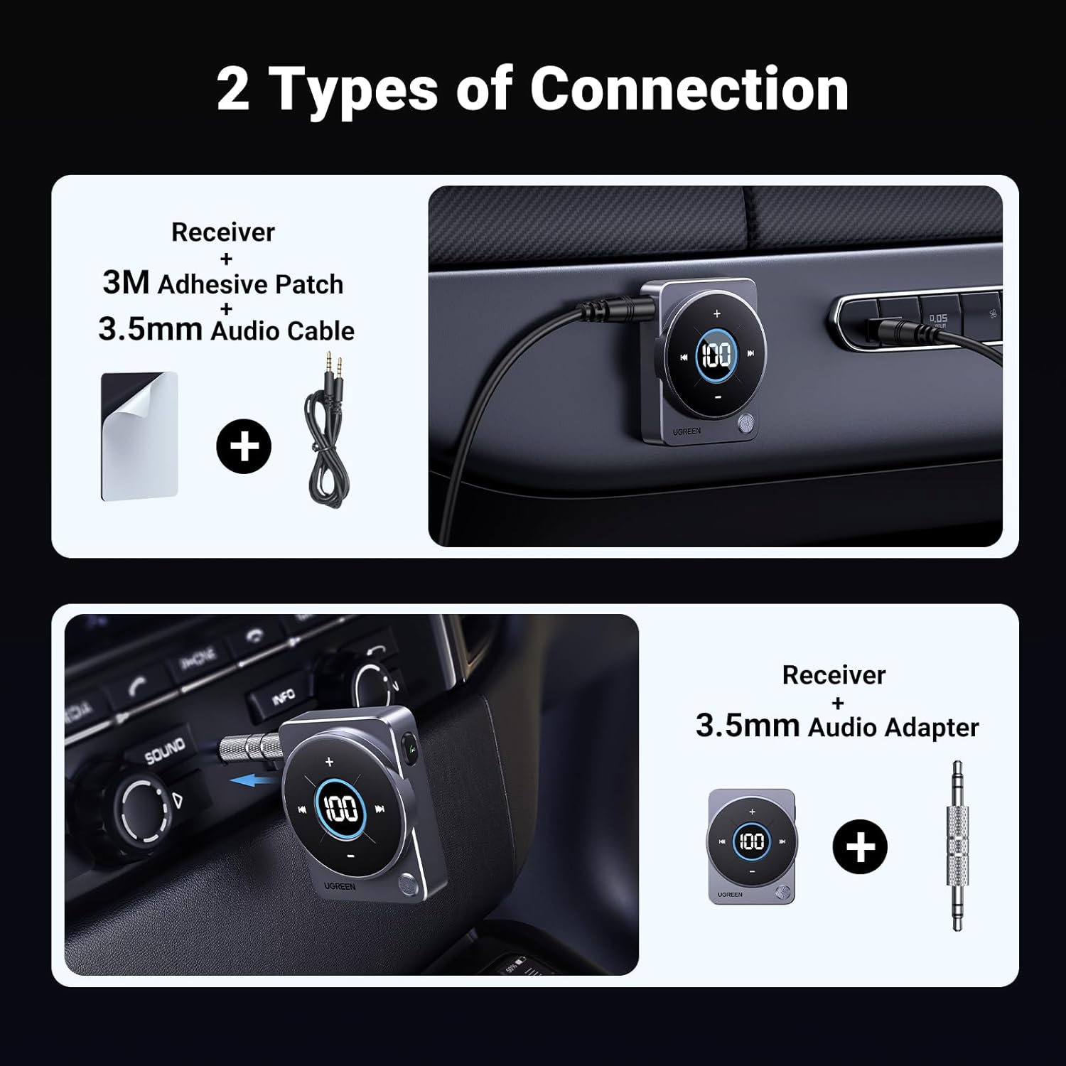 UGREEN Bluetooth 5.4 Car Adapter, Aux Bluetooth Adapter for Car with 3.5mm Jack, LED Display, Hands-Free Calling, 20-Hour Playtime, Wireless Bluetooth Receiver for Speaker/Wired Headphones/Car