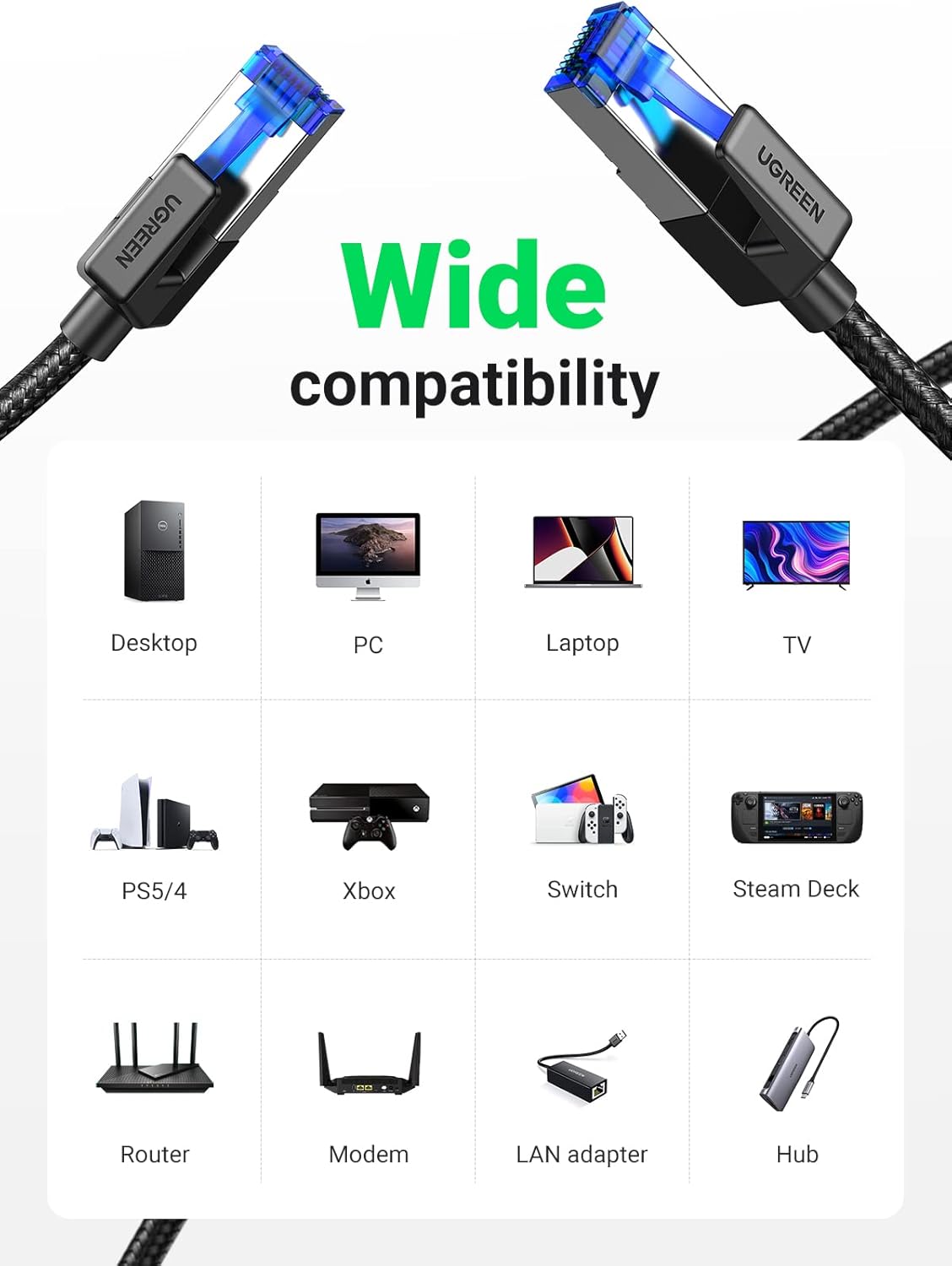 Wide Compatibility: With the RJ45 Connector, UGREEN Gigabit ethernet cable can be perfectly compatible with computers, laptops, modems, routers, PS5, PS4, PS3, X-Box series, Switch, networking switches, ADSL, network adapters, hubs, and other networking devices. It can also be fully backward and compatible with Cat7, Cat6e, Cat6, Cat5e, and Cat5.