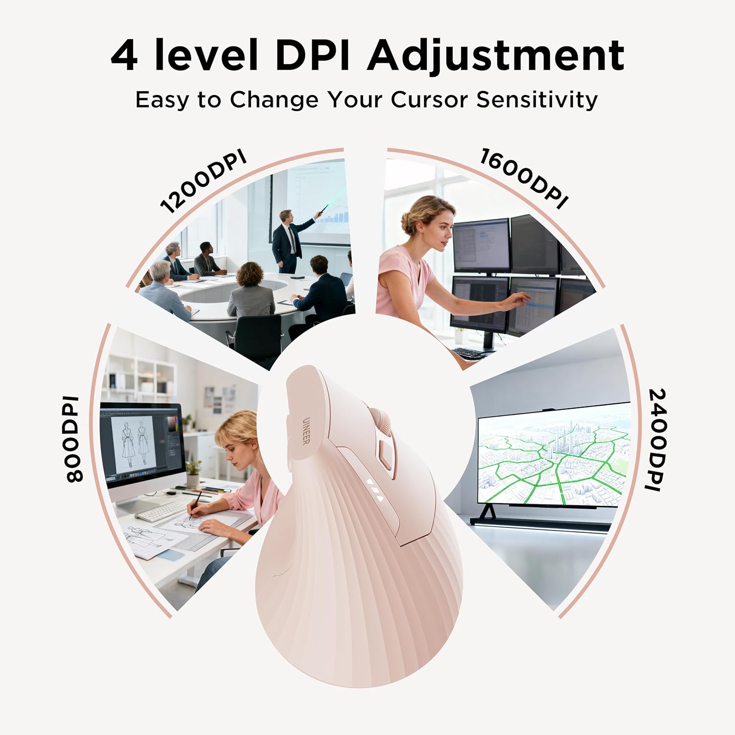 ④ Adjustable DPI Settings for Versatile Use :— Quickly switch between four DPI levels (800/1200/1600/2400 DPI) to match your specific needs, whether for document processing, web browsing, graphic design, or casual gaming. The soft-click left and right buttons provide quiet, comfortable operation perfect for shared workspaces.