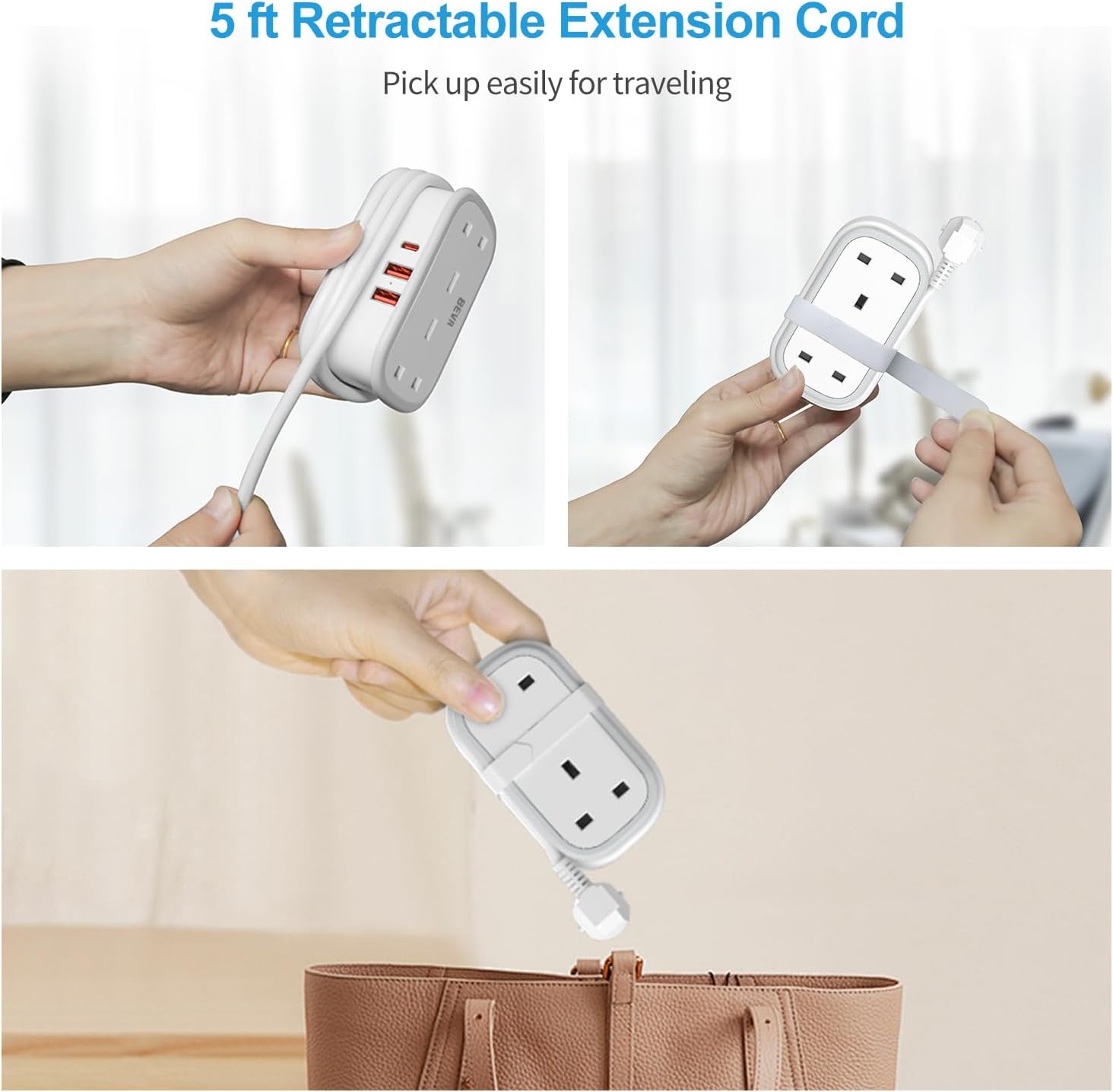 I got this for our upcoming holiday in Europe. The hotel rooms are notorious for only having one or 2 plugs in strange places so normal travel plugs don’t work as well because they have no cable. This one is like a mini extension – it’s ideal.It’s an excellent quality cable – the wire is thick and the ports are all snug with no wiggling around when anything is plugged in. There are spaces for 2 normal UK plugs then the USB options too – there is even a retractable USB type C cable hidden on the side which is a nice touch and really useful.
