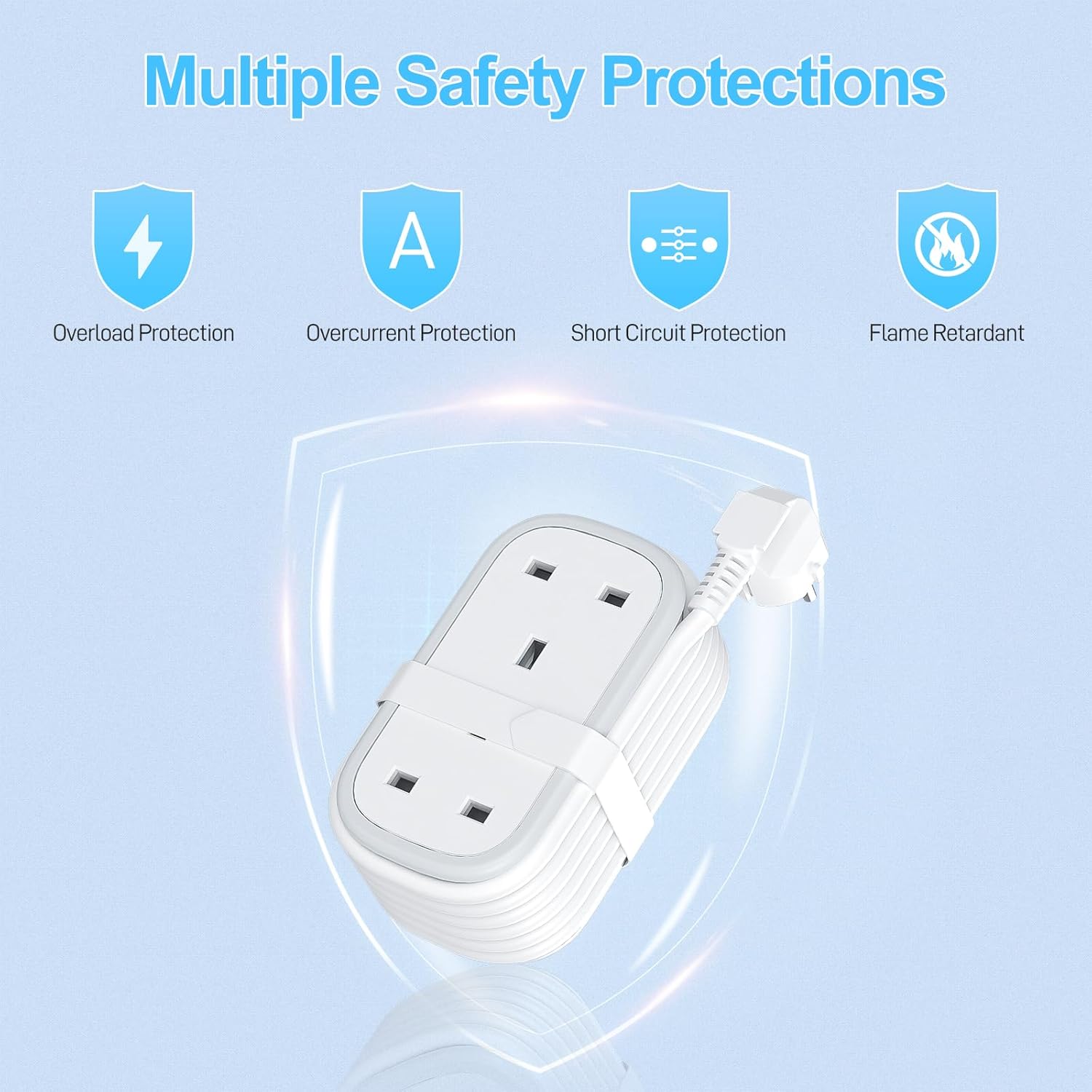 【6-in-1 UK to EU Travel Adaptor】This UK to EU plug adapter features 2 UK outlets, 3 USB ports (2A + 1C), 1 retractable USB C cable allowing you to charge up to 6 devices simultaneously. Crafted from 100% fireproof PC materials, this cube travel adapter guarantees best safety.