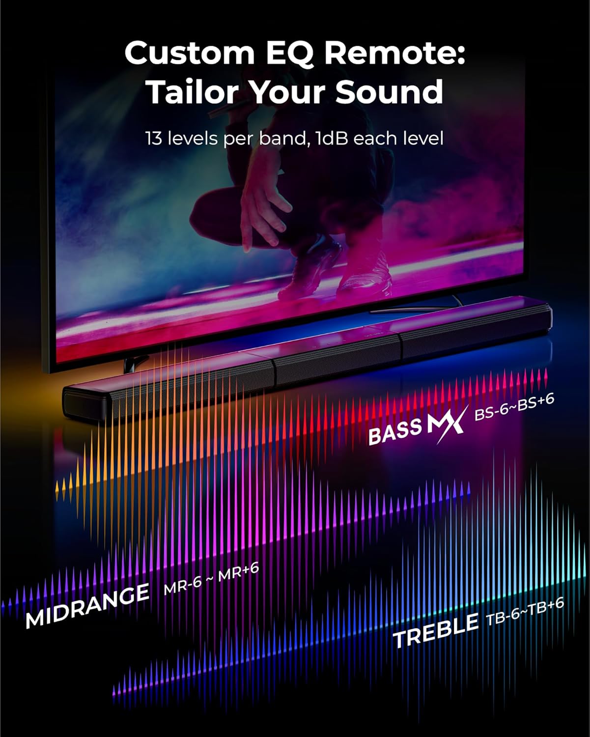 Smart App Control for Intuitive Audio Adjustments: Tailor your audio experience like never before with the Ultimea App. It offers 121 expert EQ presets across genres like Bass, Pop, Classical, and Rock, plus 10-band and 6 tailored EQ modes including Movie, Music, Voice, Sport, Game, and Night. With the advanced “Customize” feature, you can fine-tune your sound to match your exact preferences, ensuring every note is just the way you like it.
