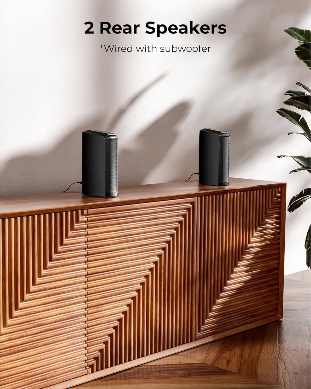2 Surround Speakers with SurroundX Technology: The two surround speakers are connect to subwoofer via wire. This setup ensures stable performance and immersive audio. SurroundX algorithm converts 2.0 PCM to 7.1 surround signal, which makes sound move around you—perfect for movies, games, and music.