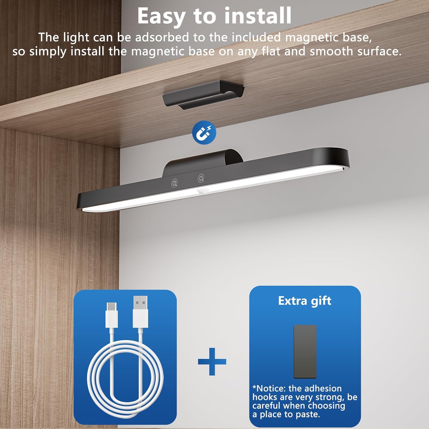 Eye protection: under-cabinet lights uses high-quality LED lamp beads, no flickering and dazzling, eye-protecting light source, very suitable for reading. What you get: desk lamp x 1, USB-C cable x 1, magnetic base x 1 (with 3M adhesive), 3M adhesive x 1 (extra), 24-hour customer service and lifetime warranty.
