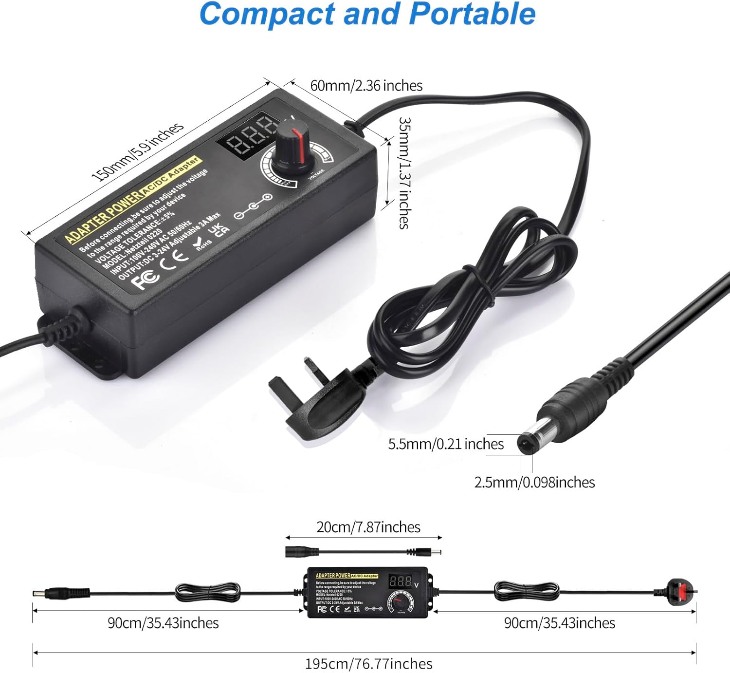 【Adjustable Power Adapter】Input: AC 100~240V, 50/60Hz, output voltage can be adjusted from 3V~24V DC. Power Max: 3A, 72W. It can supply with amps less than 3A, such as 300mA, 500mA, 1A, 1.5A, 2A, 2.5A, 3A. Referring to the industry standard requirements plus or minus 5% tolerance, the measured output voltage of 2.85V-25.2V is within the standard and normal. Before connecting this product, match it to the voltage range of the unit.