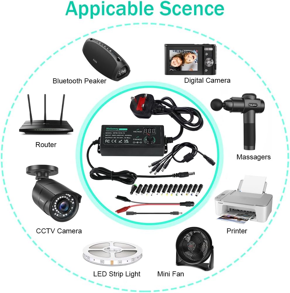 Wide Range of Applications: The 72W all-in-one multipurpose AC/DC adapter fit for many 3~24V small household electronics such as LED strips, 3D printer, TV Box, smart speaks, wireless routers, essential oil diffuser humidifier, USB fan, Wifi camera, USB Hub, hard disk box, DC motor, DC pump, digital photo frame, DVR NVR surveillance system etc.For indoor use only. (Check dc jack before buy: 5.5×2.5mm, compatible 5.5×2.1mm)