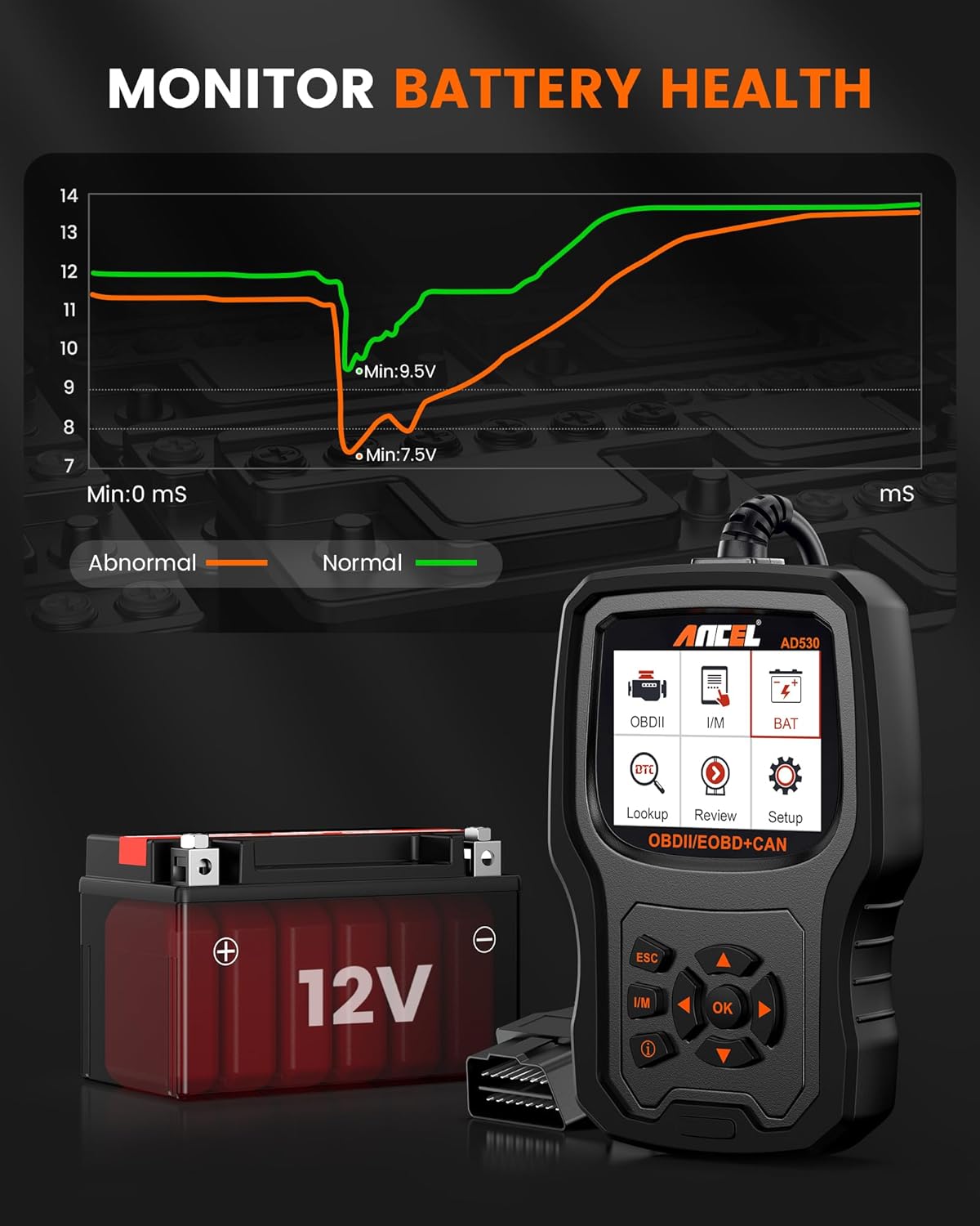 Real Time Battery Tester: ANCEL AD530 car scanner supports battery detection function that can monitor your vehicle battery automatically, shows you the real-time graph data form and accurate car battery status to protect your driving safety. This OBD2 code scanner is a must-have tool for you and your family