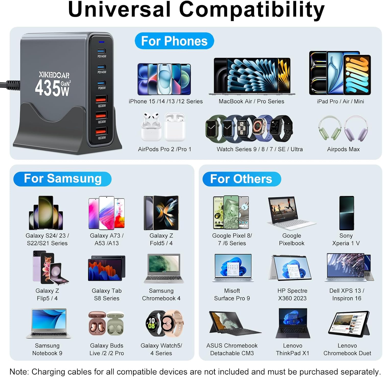 435W USB C Charger: This USB charger plug is compatible with iPhone 8, 11, 12, 13, 14, 15, 16, MacBook Air, iPad Pro, Air, Mini, AirPods Pro, Samsung Galaxy S23, S22, S21, Note Series, A Series, Book S, Tab Series, Surface, Google Pixel, Dell XPS, Switch, PS5, Tablets, etc.