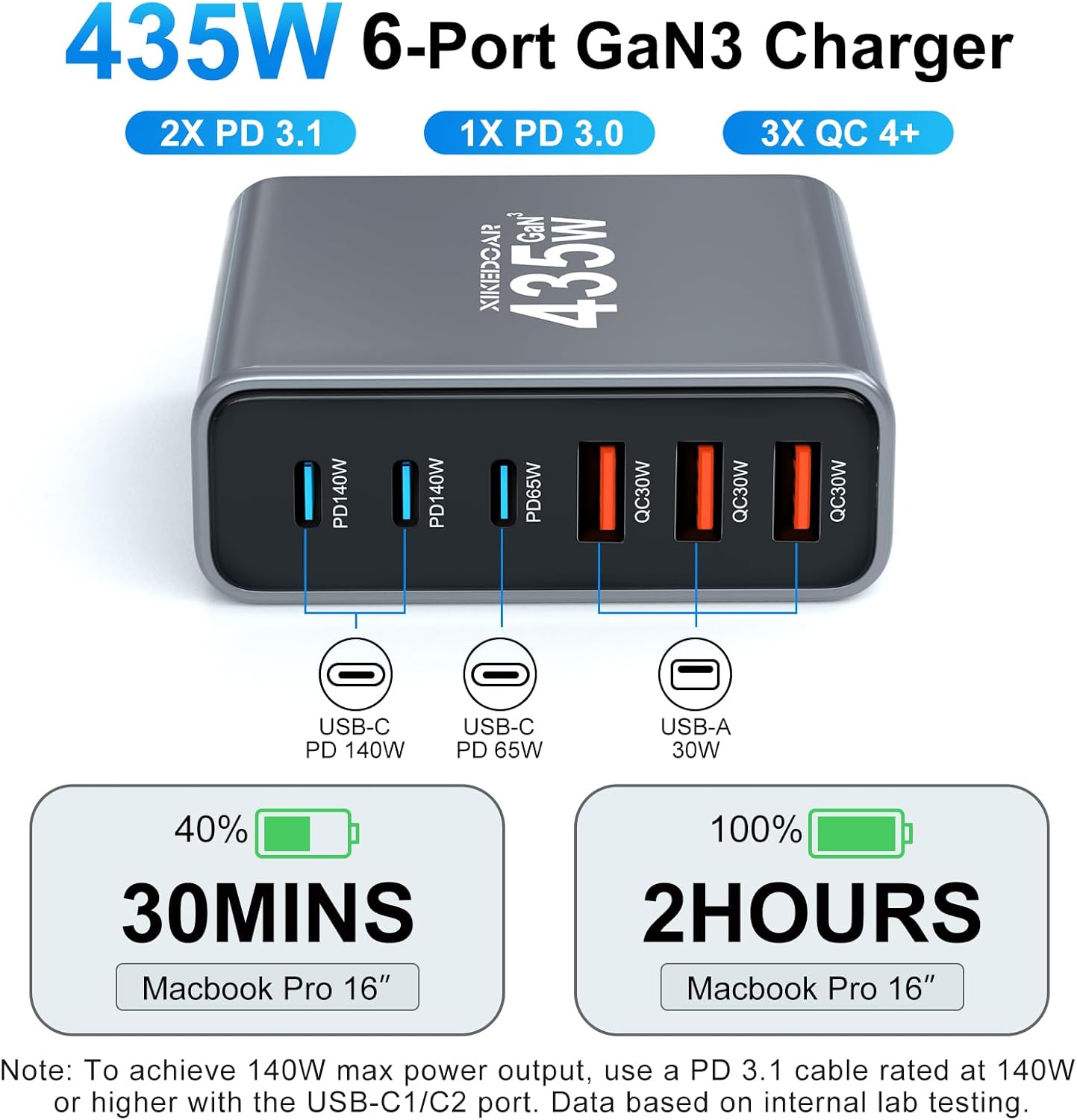 6-Port Charger Plug: Our USB C charger is equipped with 6 USB charging ports, including 3 PD USB C ports (max 140W) and 3 QC USB A ports (max 30W), with a total output power of 435W, which can charge your smartphone, tablet, laptop or other devices at the same time. If you only charge one laptop, the USB-C 1 port is the best choice for laptop charging.