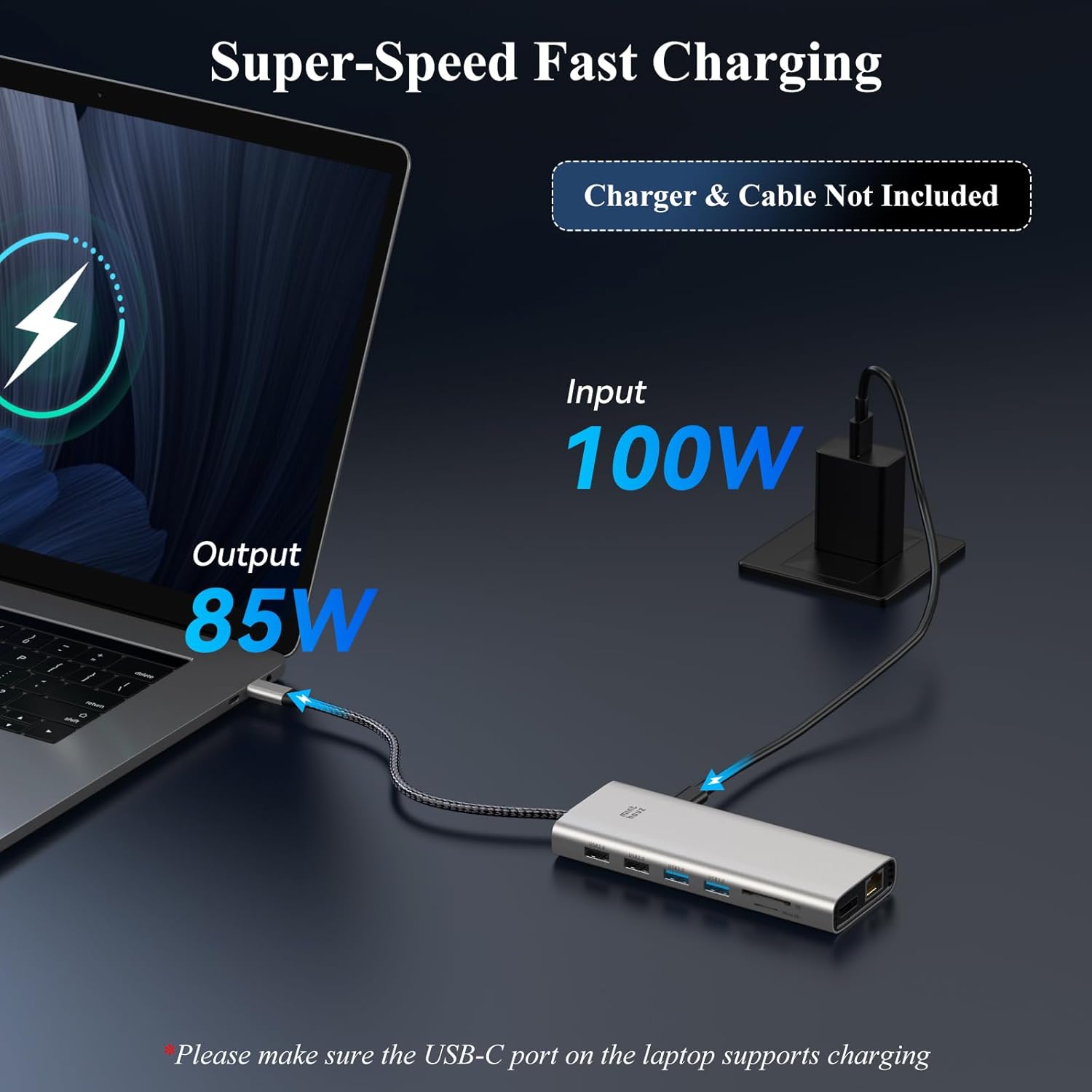 The hub supports any 100W PD charger (UK plug recommended). Note: The hub itself delivers 85W to your laptop (sufficient for MacBook Pro 16 + 15W for peripherals, making it ideal for UK travellers needing a single hub for work and hotel setups.