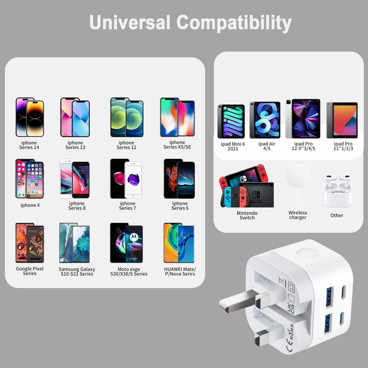 I’ve got an older iPhone for work and a modern personal iPhone (using a usb C connector), alongside various other things that require charging either by standard usb or new usb c. As I’m away for work often, this is brilliant as I can charge multiple devices without having to sacrifice space in my bag for additional plugs. Decent quality with the pins able to be folded for space saving. Looking at other plugs, this was on the cheaper end however still just as good so definitely value for money at the time of purchase. One thing I’ve noticed is that the devices can start to feel like they’re producing heat whilst being charged but that’s not the plug itself. The plug itself has been easy to use throughout the uk from hotels to offices to houses.