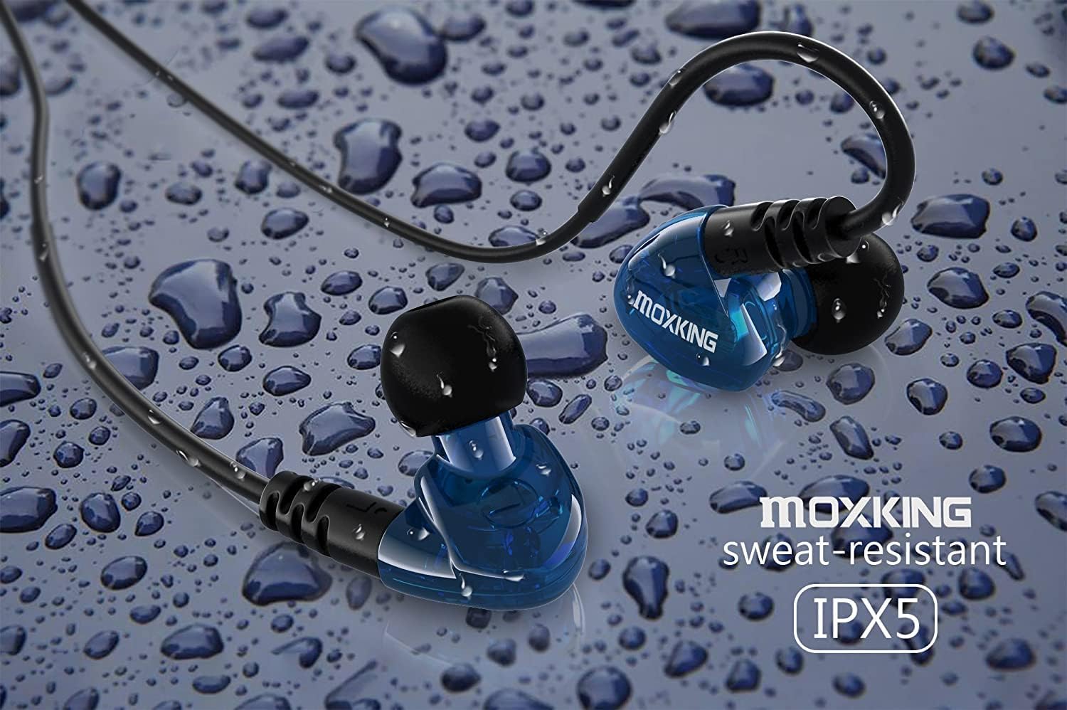 In ear angle is specially designed to get secure fit. The loop around ear wire keeps these workout headphones stay in place even while sweating. They are also sweatproof exercise headphones, good for running, jogging, weight lifting, cardio, etc.