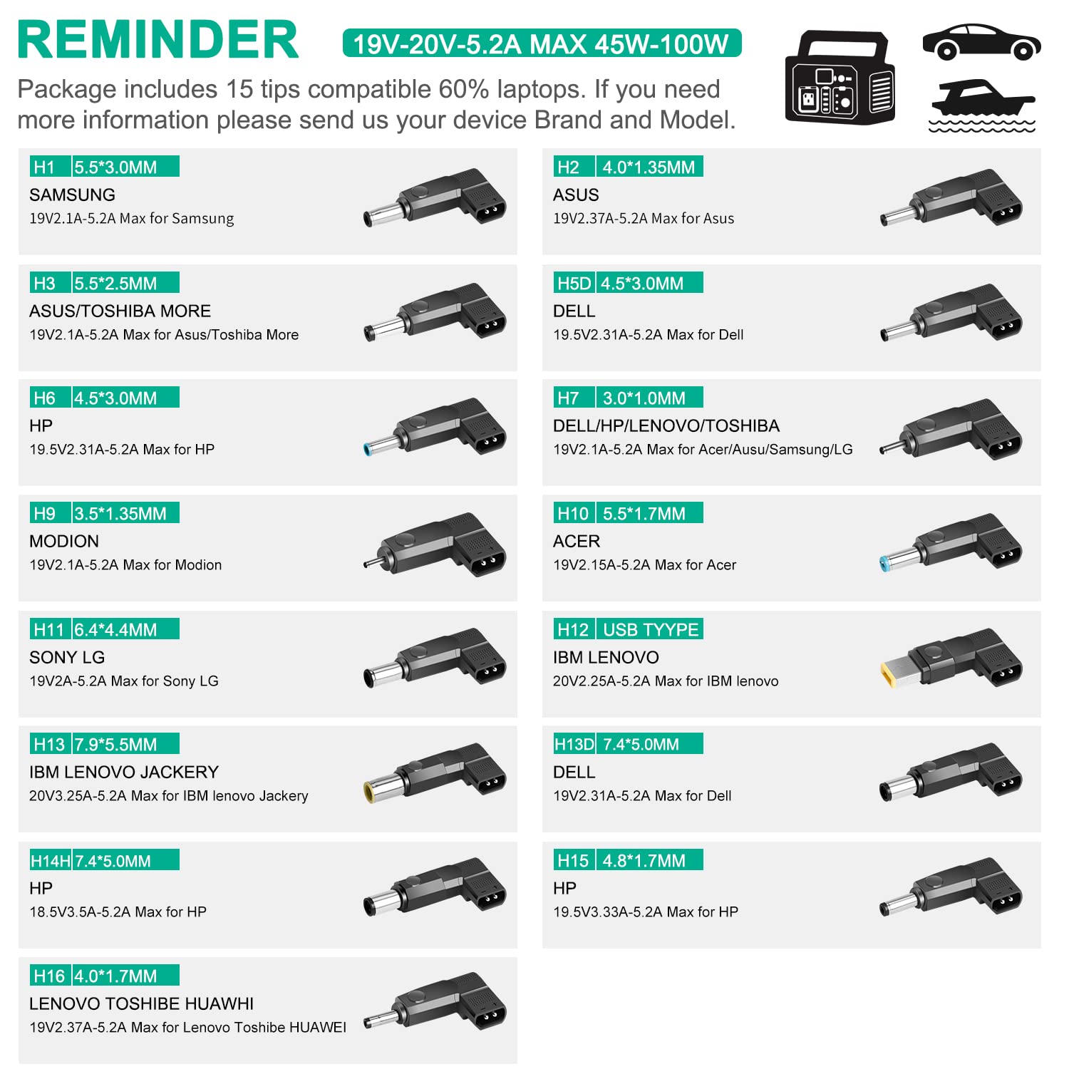 Very satisfied with this item for my laptop making it easier to use a power bank plus a bonus due to the number of connecter ends I can use my ultrasonic cleaner that had a damaged lead .