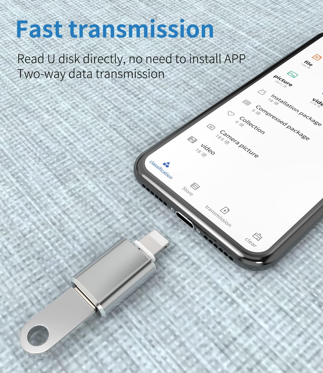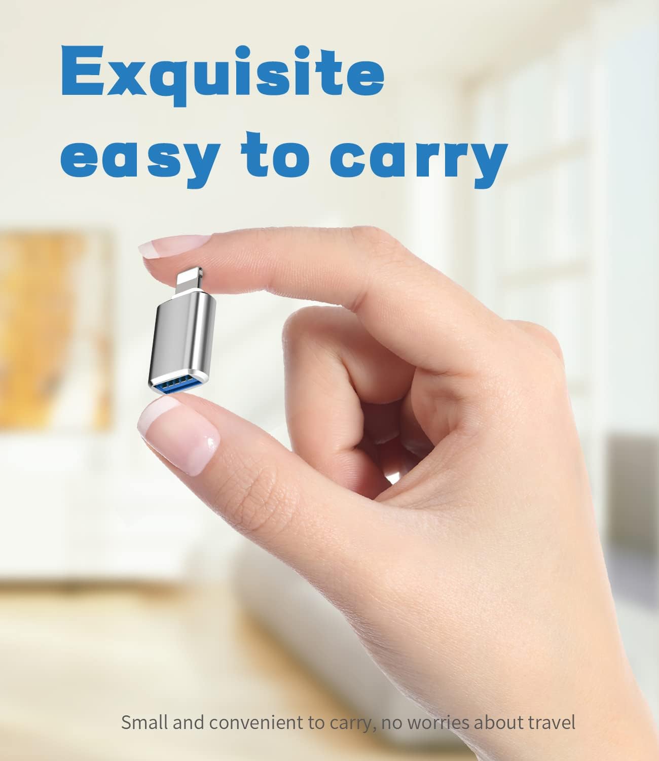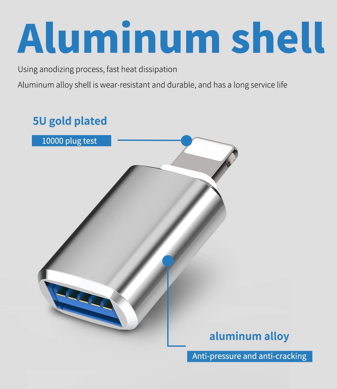 Enhance the capabilities of your for iPhone or for iPad with this versatile Lightning to USB Adapter. Designed to support OTG (On-The-Go) functionality, this adapter allows you to connect USB-A devices like keyboards, mice, flash drives, and card readers to your for apple device, enabling seamless file transfers and enhanced productivity.With its USB 3.0 technology, you can transfer files at speeds up to 5Gbps, making it ideal for quickly moving large photo and video files, documents, and more. It offers plug-and-play convenience, so no need for additional apps or software – just plug in the adapter, open the “Files” app, and start transferring your data.The durable aluminum casing ensures better heat dissipation and corrosion resistance, providing long-term reliability and protection. Whether you need to connect external storage, use a mouse or keyboard, or access other USB peripherals, this adapter is the perfect solution for users of Lightning-equipped for iPhones and for iPads.Compatible with a wide range of devices, including for iPhone 14/13/12/11/X/SE and various for iPads, this adapter offers an essential accessory for for apple users looking to expand their device’s functionality effortlessly.