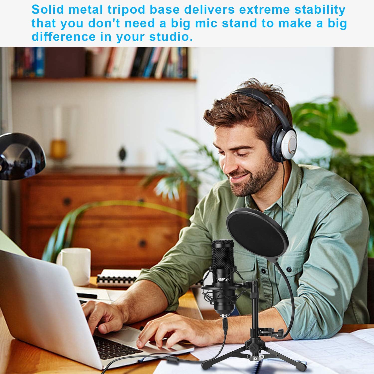 USER-FRIENDLY DESIGN: It is equipped with a desktop metal tripod to allow you to use it easily in front of the computer. With a foam windscreen and a pop filter, the mic can record your voice well and render it hear clearly. The metal shock mount holds the mic steady along with dampening function. It is applicable to video voice-over, YouTube, podcast, Skype conference etc.