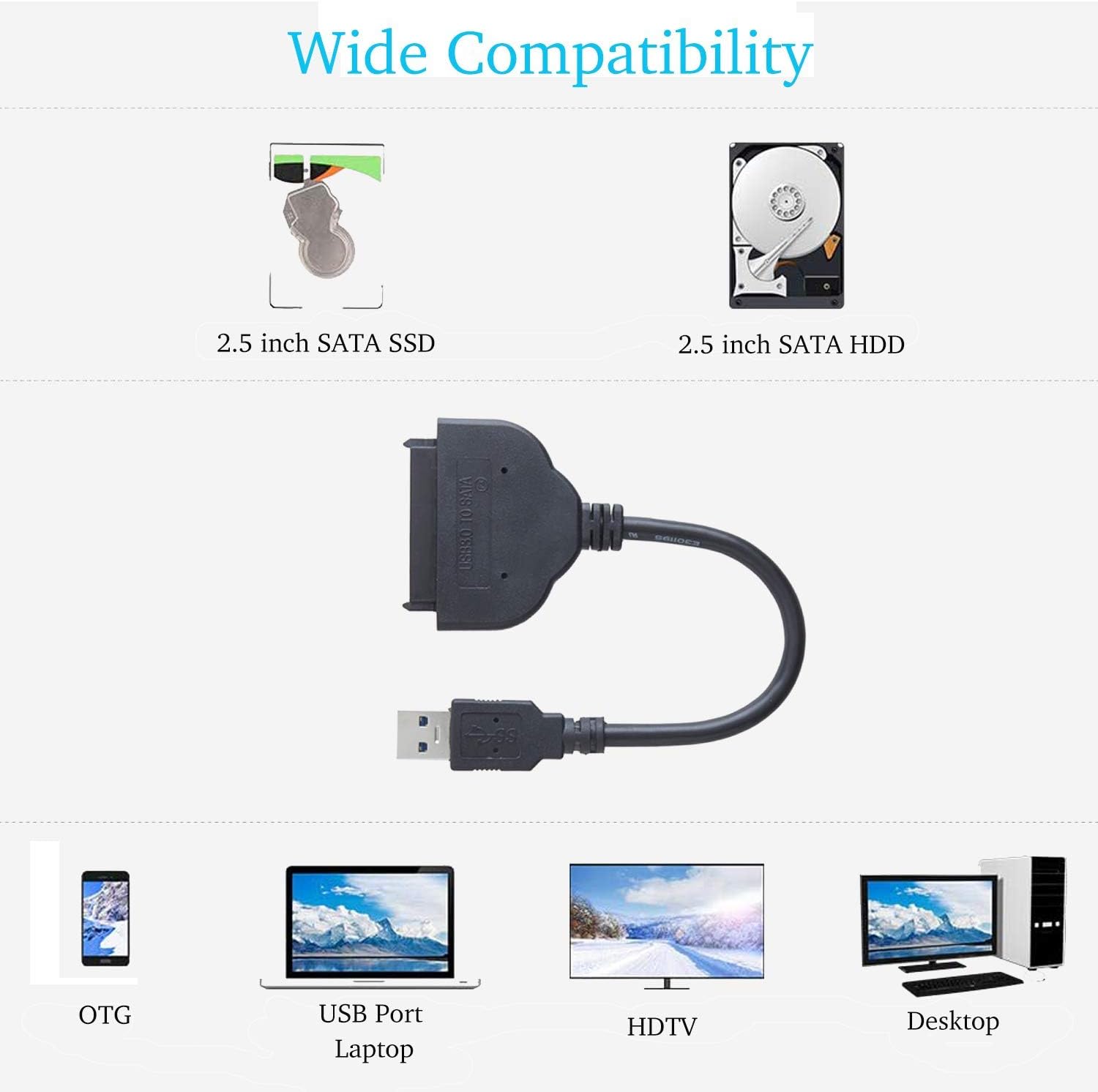 This Cable Fit with most 2.5″ SATA HDD & SSD compatible with WD, Seagate, Samsung, SanDisk, Crucial, Kingston, TOSHIBA, HITACHI. With USB 3.0 to SATA Cable You can also connect Your External drive with laptop, PC, Smart TV and with OTG function of Android Phones.