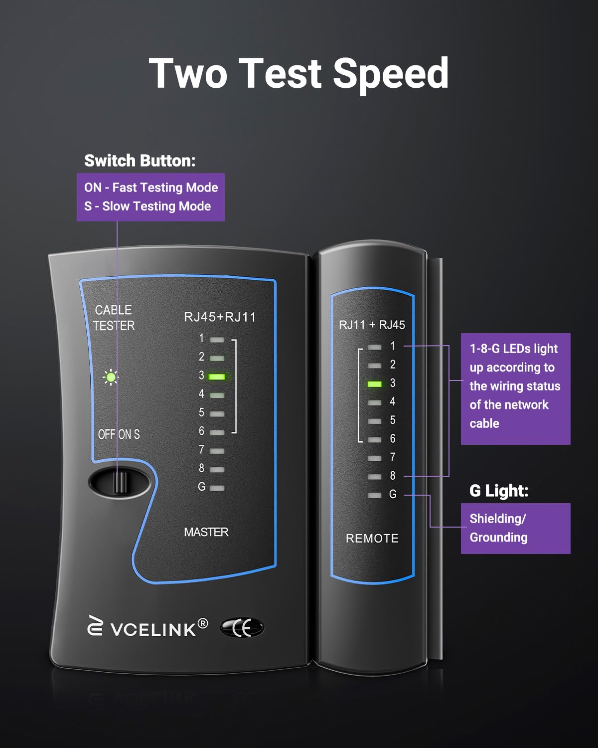 FAST AND CLEAR LED CABLE CHECKS: The ethernet cable tester quickly checks cable status with LED indicators for fast/slow modes. The S button pinpoints faults, the G light identifies shielding and grounding, and a high-sensitivity chip ensures fast results