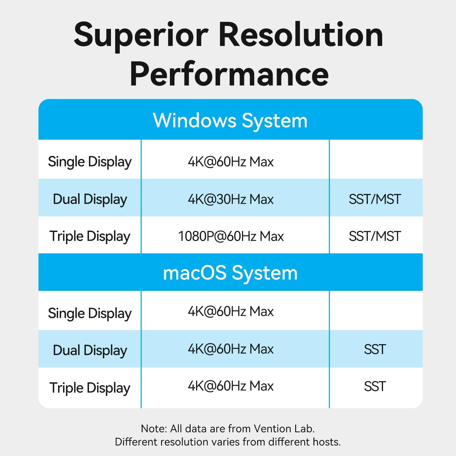 The VENTION 15-in-1 USB-C Docking Station has been an absolute game-changer for my workspace! Iâve been using it for a few weeks now, and it truly delivers on all fronts.What I love most is the ability to connect up to 2 or even 3 monitors with ease. The dual 4K HDMI and DisplayPort outputs work flawlessly, giving me a clean and extended display setup thatâs ideal for multitasking, creative work, or productivity-heavy tasks.Itâs also incredibly versatile â Iâve used it with both Windows and Mac systems, including machines with Thunderbolt 3/4 support, and it works like a charm. No driver hassles, just plug-and-play.Other standout features include:⢠10Gbps USB ports that are super fast for file transfers⢠100W Power Delivery, which keeps my laptop charged while using everything else⢠Reliable wired internet with RJ45 Ethernet port⢠Audio in/out, SD/TF card slots, and more â all in one compact designOverall, this dock has massively improved my workflow and turned my laptop into a full desktop powerhouse. Highly recommended for anyone needing a reliable, feature-rich dock to extend their workspace and boost productivity!