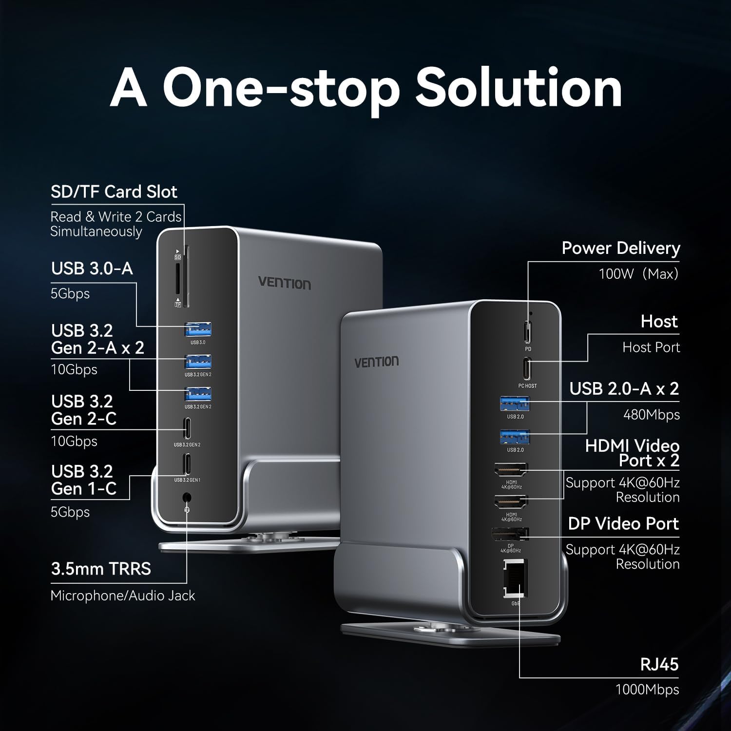 15-IN-1 USB-C DOCKING STATION:The VENTION 15-in-1 USB-C Docking Station is the ultimate laptop expansion hub, featuring 2x4K@60Hz HDMI ports, 1x4K@60Hz DP port, 10Gbps USB-C, 10Gbps USB-A ports, USB 3.0, USB 2.0 ports, 100W Power Delivery (PD) port, 3.5mm audio jack, SD/TF card reader, RJ45 Gigabit Ethernet, and a PC host port, covering all your connectivity needs.