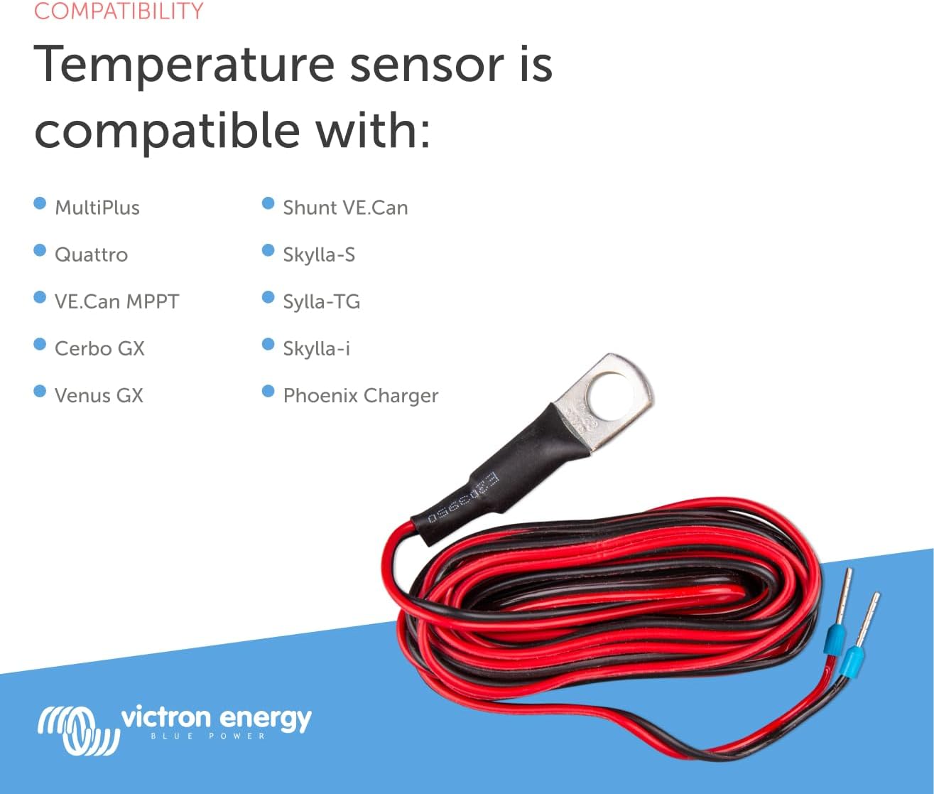 Victron Energy Temperature Sensor for Victron Energy Quattro, MultiPlus inverter/chargers and also Compatible with Victron Energy GX devices (Cerbo GX, Venus GX, etc)