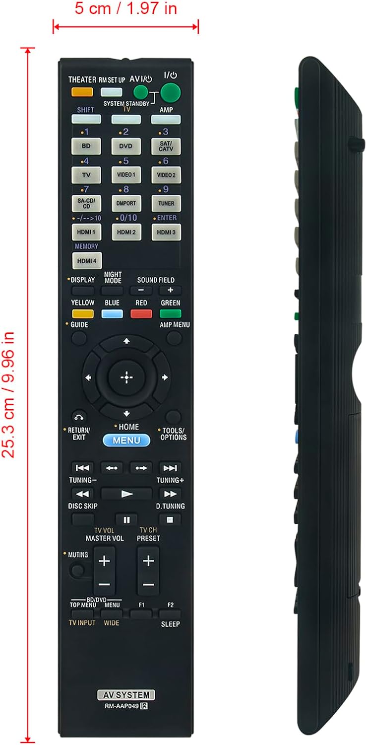 The RMAAP049 RM-AAP049 Remote control is ideal for Sony AV System Home Theater remote control replacement. Perfect to replace your broken or old one. Don’t miss it.