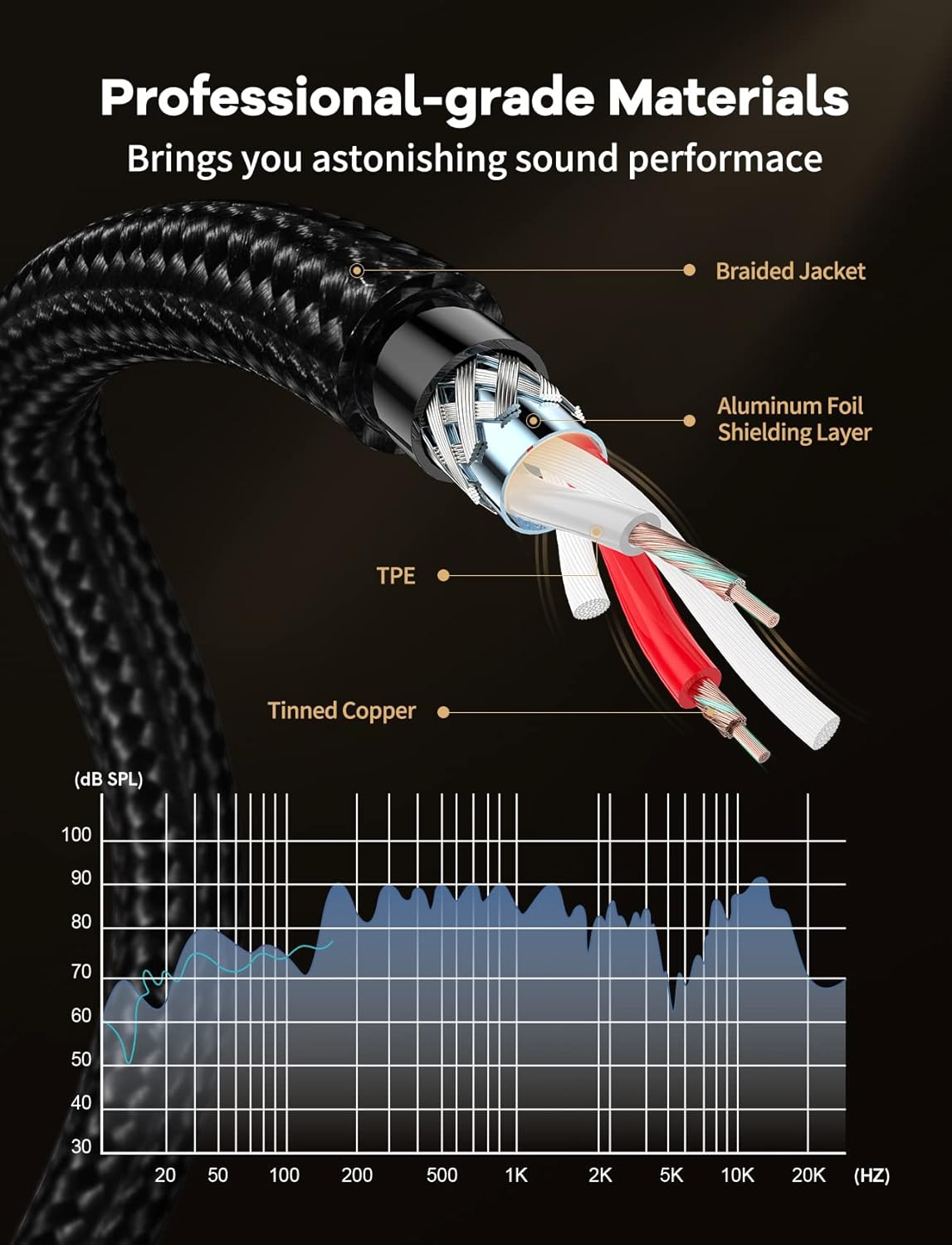 Different 1:1 design: The branch of this audio cable is half of the whole length, enhancing its function for mixing music Excellent Material: 24K gold plated plug, aluminum shell, cotton braided jacket, pure copper