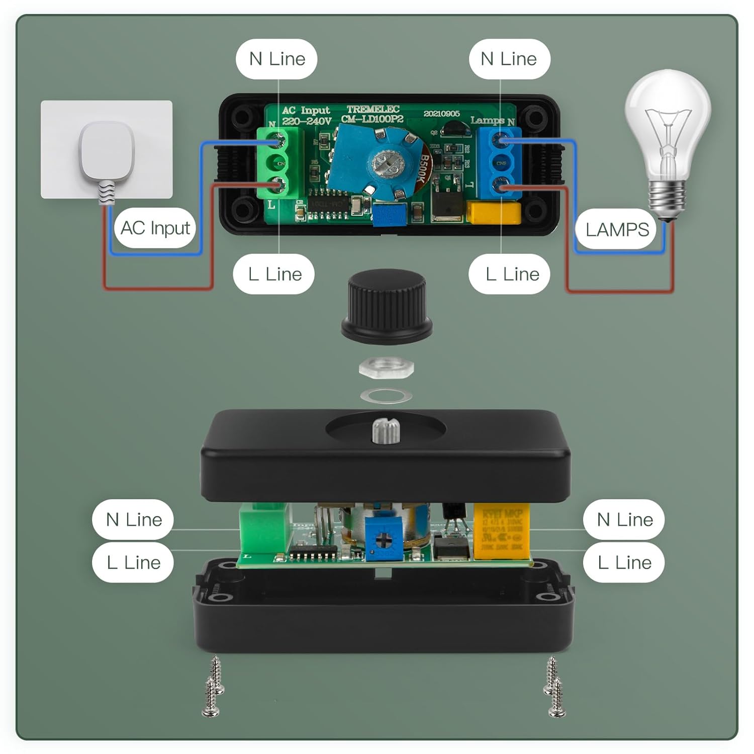 Energy Savings: Inline dimmer switch for lamp work voltage: 220-240V AC. The applicable power: The incandescent lamps/halogen lamps: 3-100W. Dimmable LED ligths (PF=Power factor): PF>0.9: 3-100W; PF>0.5: 3-50W, The lowest brightness can be preset, cut energy costs and extend bulb life
