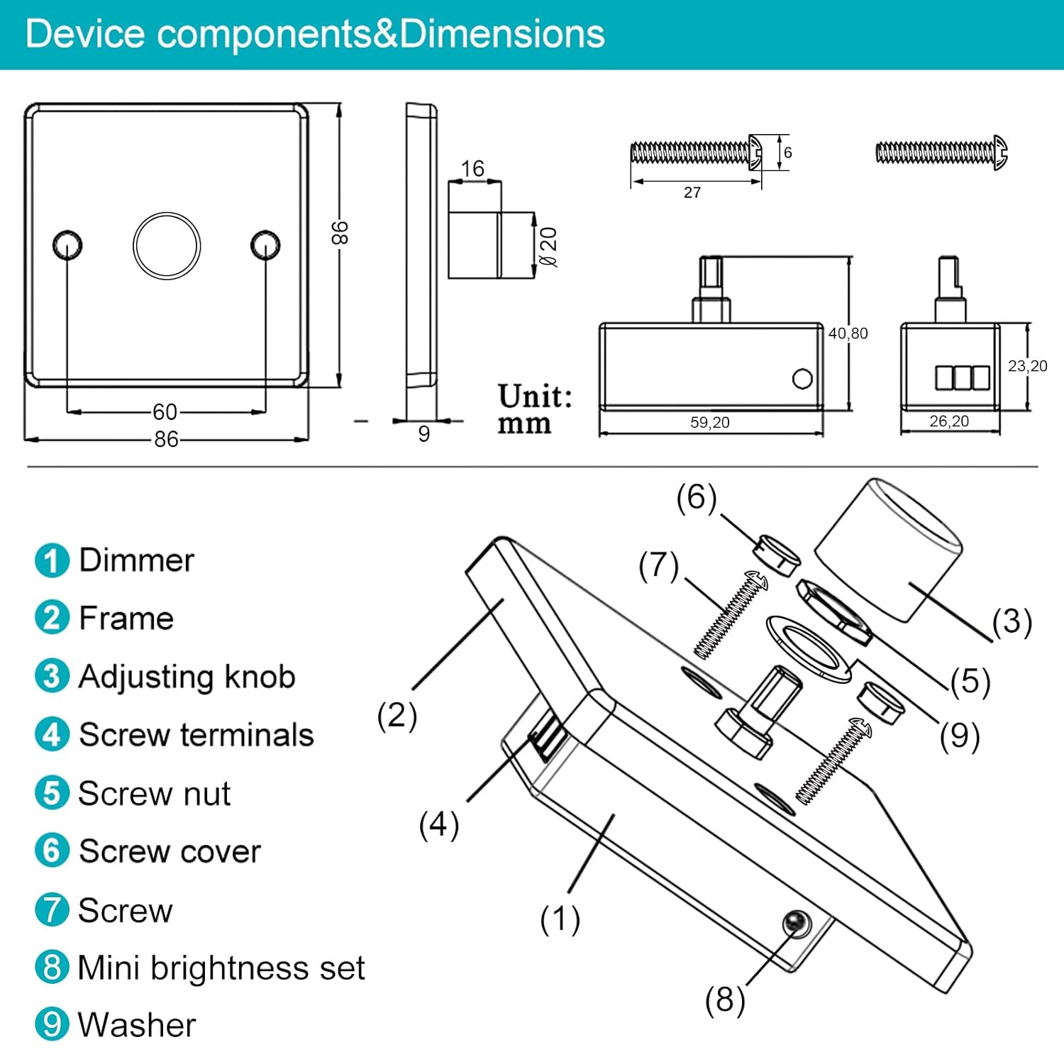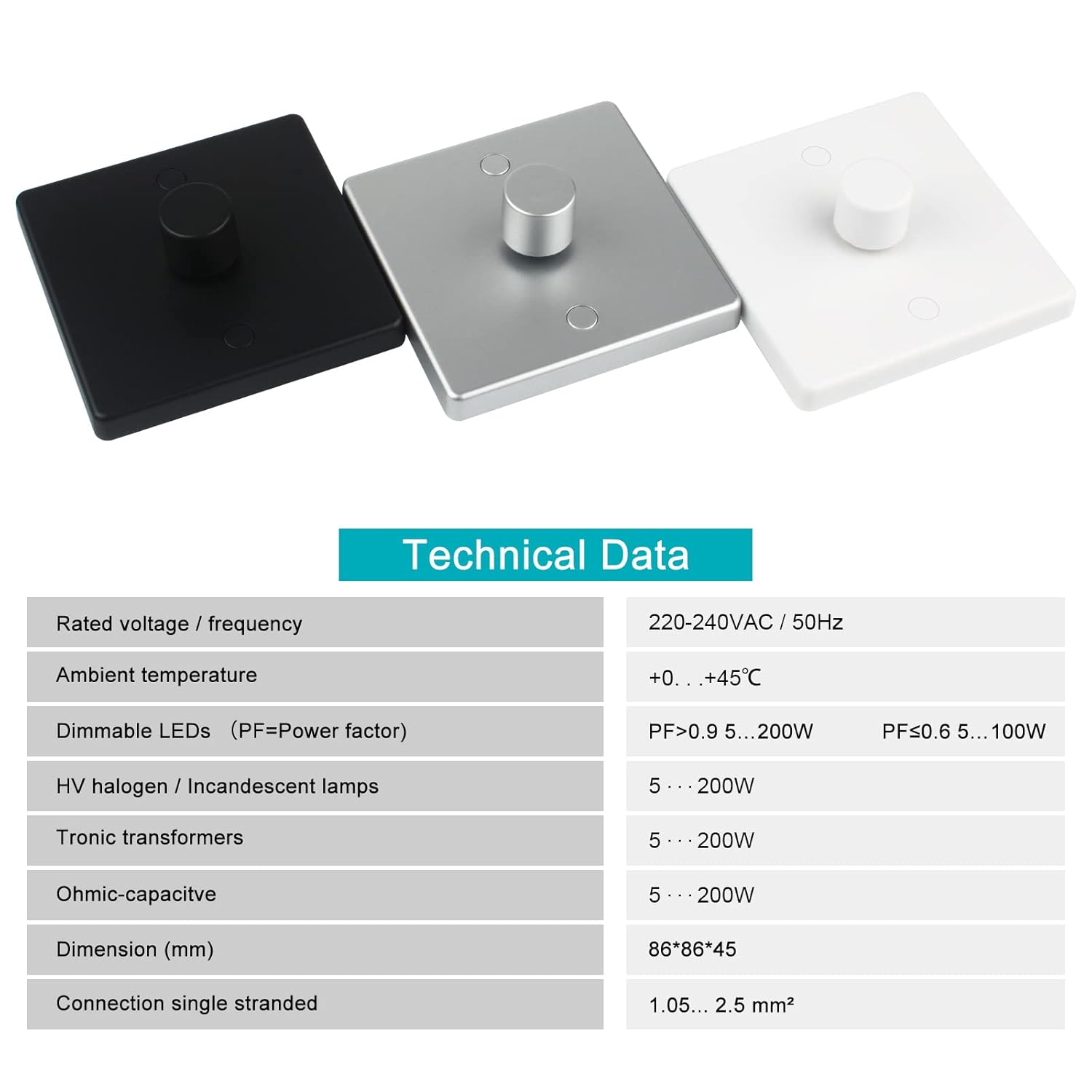 Product Specifications: The dimming range of this trailing edge dimmer switch is 3% -100%, and the entire dimming process is completely silent with no noise interference. The voltage application range is 220-240V/50Hz, Suitable for 5W-200W dimmable LED light, Incandescent light, halogen light and normal tungsten bulb. (PF=Power factor): PF๏ผ0.9=200W PF๏ผ0.9=100W