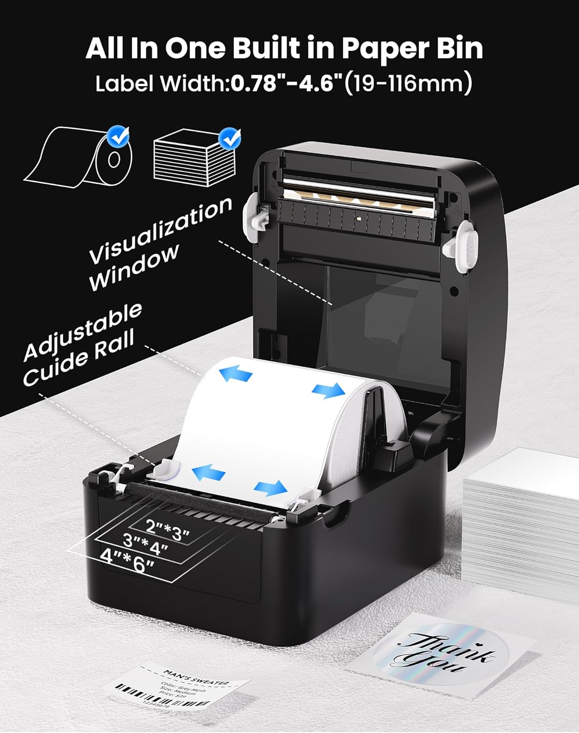 Massive Built-in Paper Tray, Zero Extra Accessories Say goodbye to bulky external trays! Our thermal label printer features an oversized built-in paper compartment holding 500+ sheets, eliminating the need for additional paper holder. Save space and costs with all-in-one design.