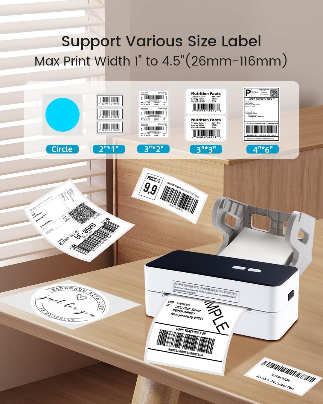Multi-functional Label Printer: This postage label printer has auto paper correction and smart paper return function, supports a maximum print width of 4.09 inches (109mm), this self-adhesive label printer labels are suitable for printing shipping labels, warehouse labels, address labels, barcode labels, product labels, and any labels you may need.