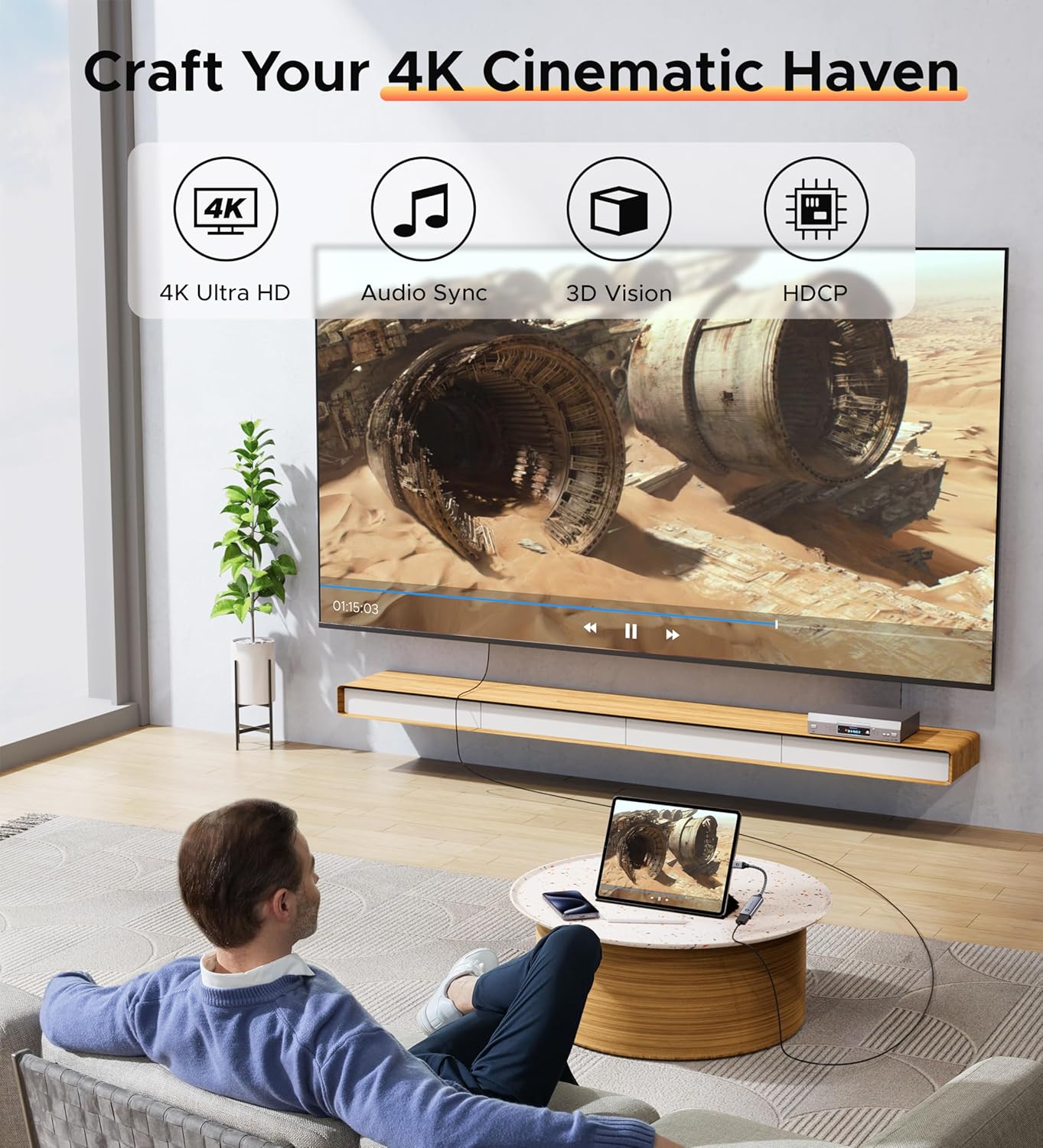 【4K Ultra-Clarity】 Get high-definition visuals with support for 4K@30Hz, 2K@60Hz, and 1080p@120Hz. The adapter’s HDCP compliance ensures secure streaming from platforms like Netflix, Hulu, HBO+ and Disney+