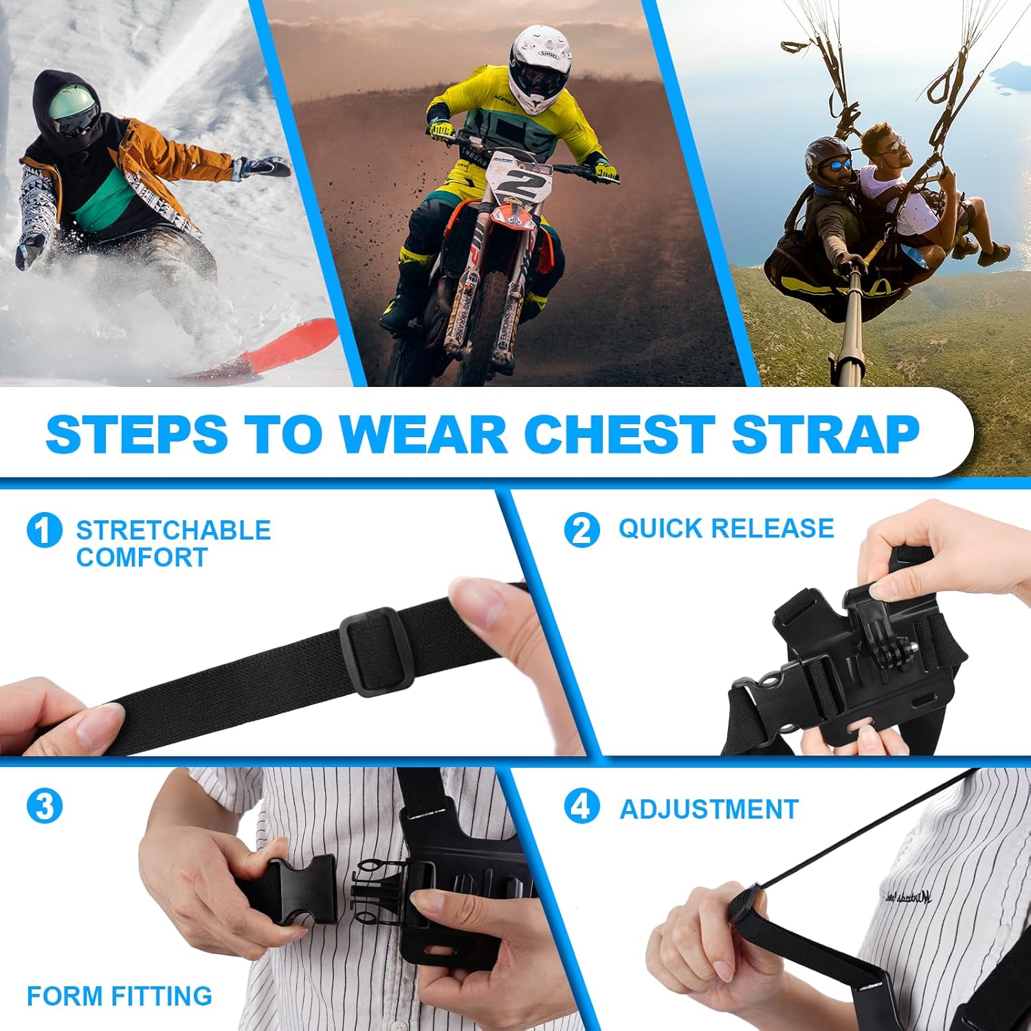 Waterproof Chest Mount, Harness, Strap, Compatible with Gopro Hero 13 12 11 10 9 8 7 6 5 4 3 / DJI, AKASO, Apeman, Apexcam & Most Action Cameras, Chest Strap +2 J-Hook, Thumbscrew & Storage Bag