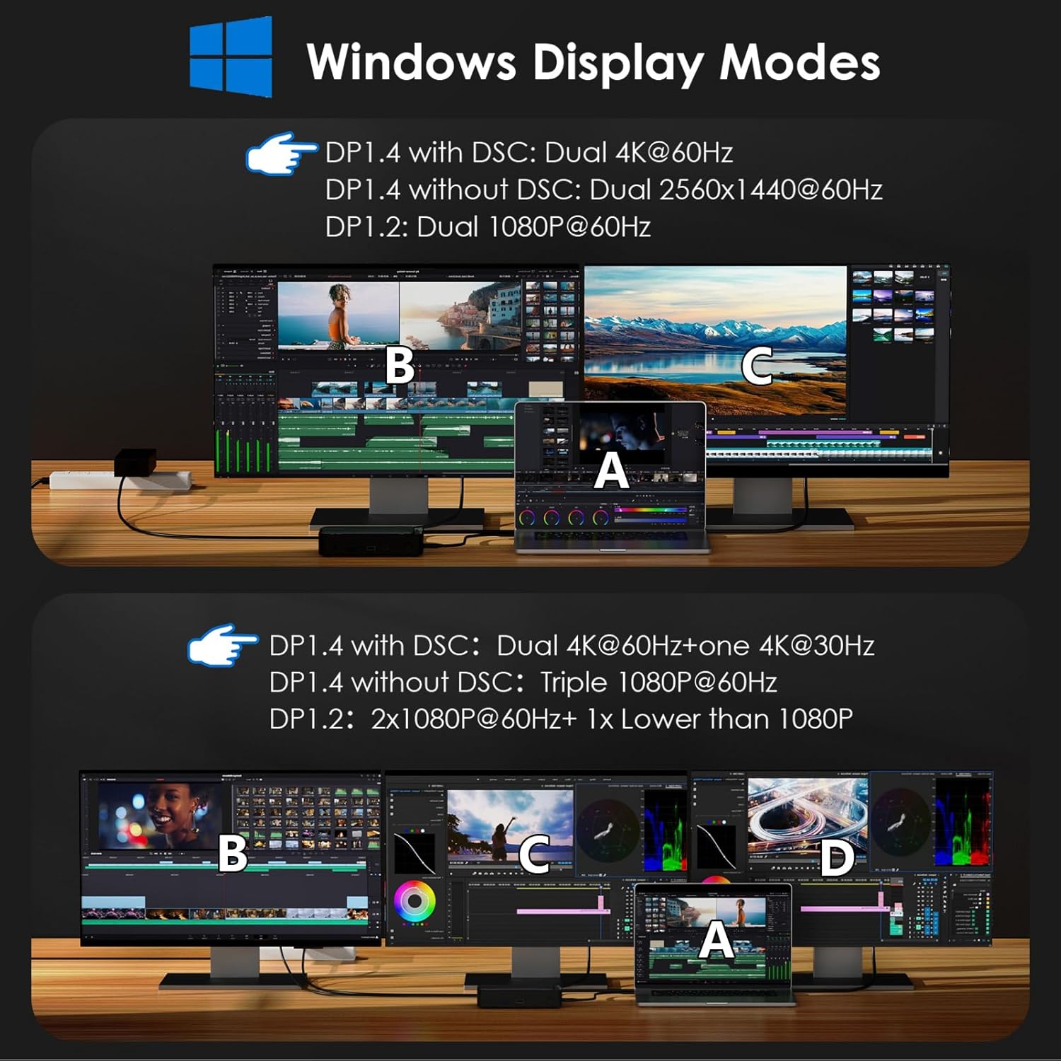 【USB C Dock 4K Display】Type C to 4K HDMI/DP multiport hub can easily mirror or extend your device’s screen. Connect up to three monitors with dual 4K@60Hz + one 4K@30Hz resolution by using 2HDMI and DP ports (under DP1.4 with DSC), which is perfect for presentations, games, videos, and expanding your workspace. NOTE: *Some Windows laptops may only support 3 monitors (including the host screen) due to their graphic card limitations; macOS-based laptops can only expand one external display with different content.