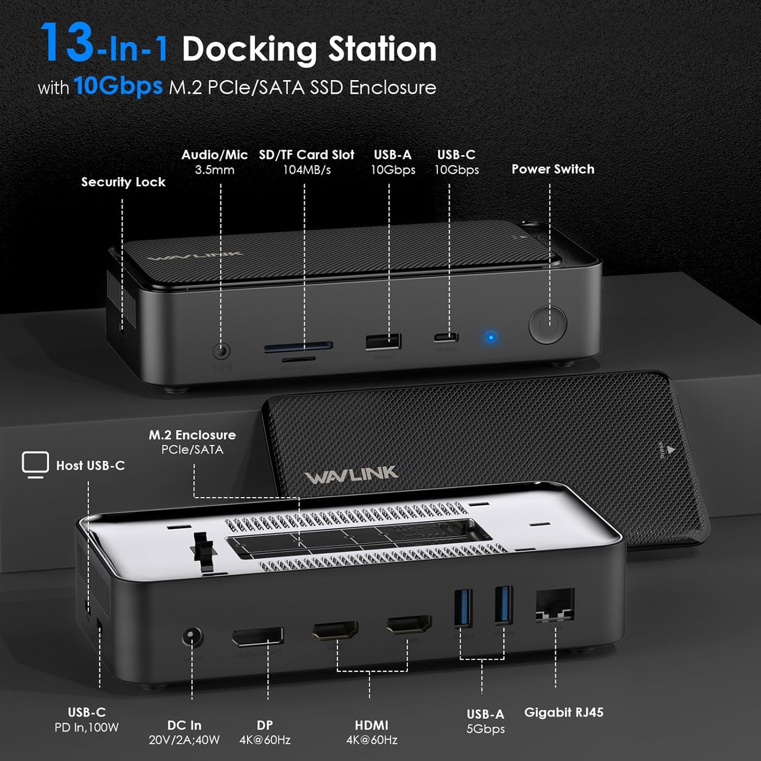 【13-in-1 Laptop Docking Station】Features a range of connection options for plug and play, including a built-in M.2 SSD enclosure, 20V DC In, 4K@60Hz DP, 4K@60Hz HDMI*2, 5Gbps USB-A(5gbps) * 2, Gigabit RJ45, Host USB-C, USB-C PD IN (100W), 3.5mm Audio/Mic, SD/TF Card Slots (104MB/s), and 10Gbps USB-A/USB-C. With 13 ports in one dock, this versatile docking station is designed to provide seamless integration between your devices and the host system. Supports M.2 PCIe NVMe SSD and M.2 SATA (B&M-Key).