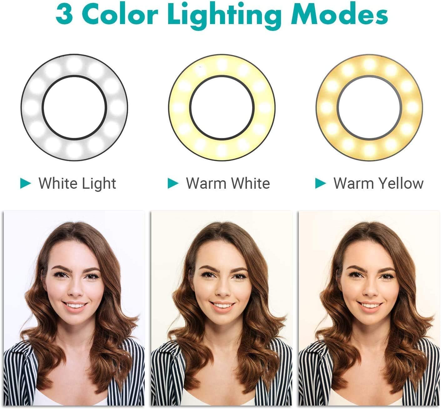 26cm Ring Light designed with 3 light modes (Cold/Natural/Warm Light) and 10 adjustable brightness under each light mode;