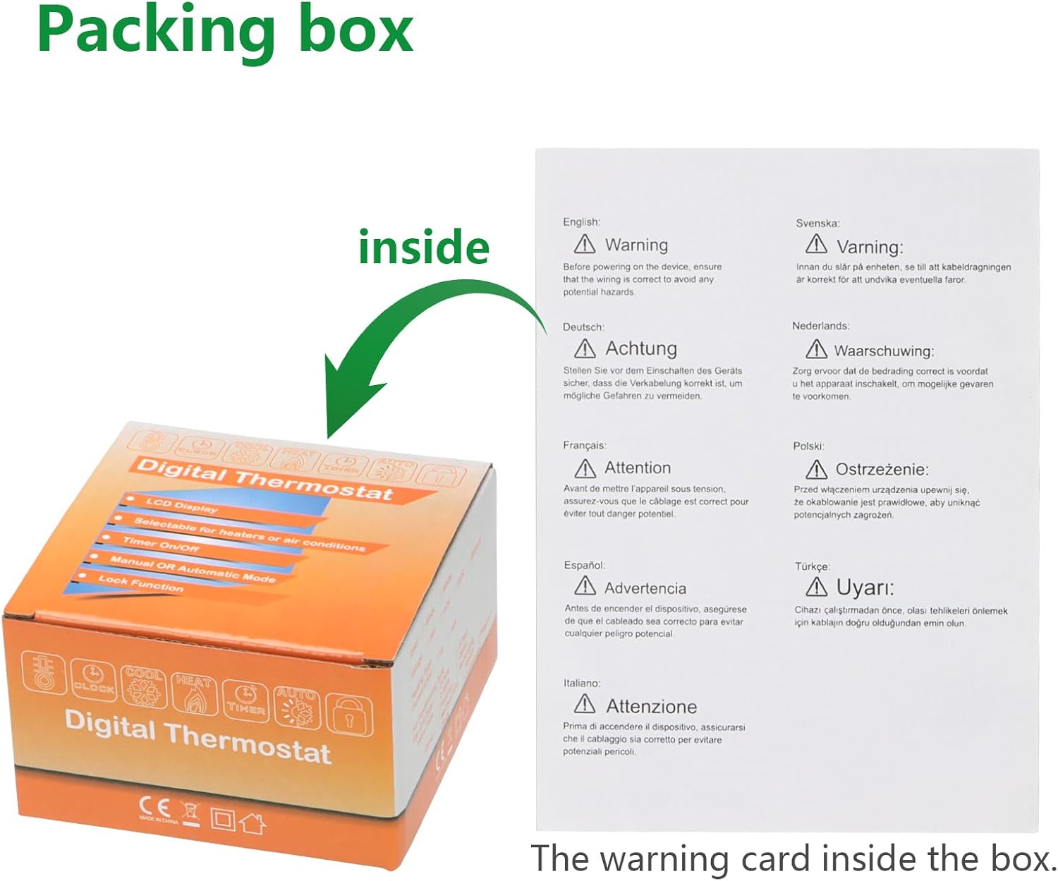 Power Supply Voltage AC230V±10% 50/60Hz Power Consumption <2W Setting Range 5~35℃(can adjust to 35-90℃) Switch Differential 0.5~10℃ adjustable (factory setting±1℃) Ambient Temperature -5~50℃ Temperature control accuracy ±0.5℃ Measured Range -9.9~99.9℃ Inside Sensor NTC B=3380 10k @25℃ Protective Houseing IP20 Housing Material Anti-flammable PC Package Content 1 x Thermostat,2 x Screws,1 x Manual