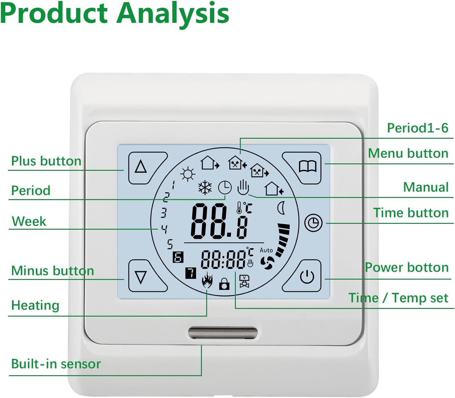 The digital thermostat has a large LCD display, which displays the room temperature, set temperature and current heating status in real time, making it easy to understand the current status of the thermostat.