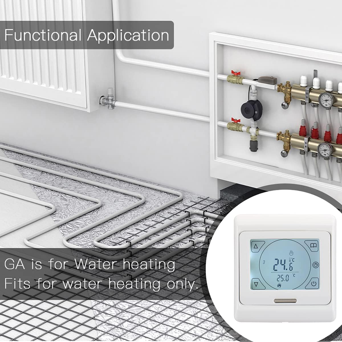 This programmable floor heating thermostat is compatible with water floor heating systems, with a measurement accuracy of 0.1°C, embedded installation, suitable for 86 European cassettes,Output AC230V 3A, giving you the control you need to save money and energy and maximize comfort.