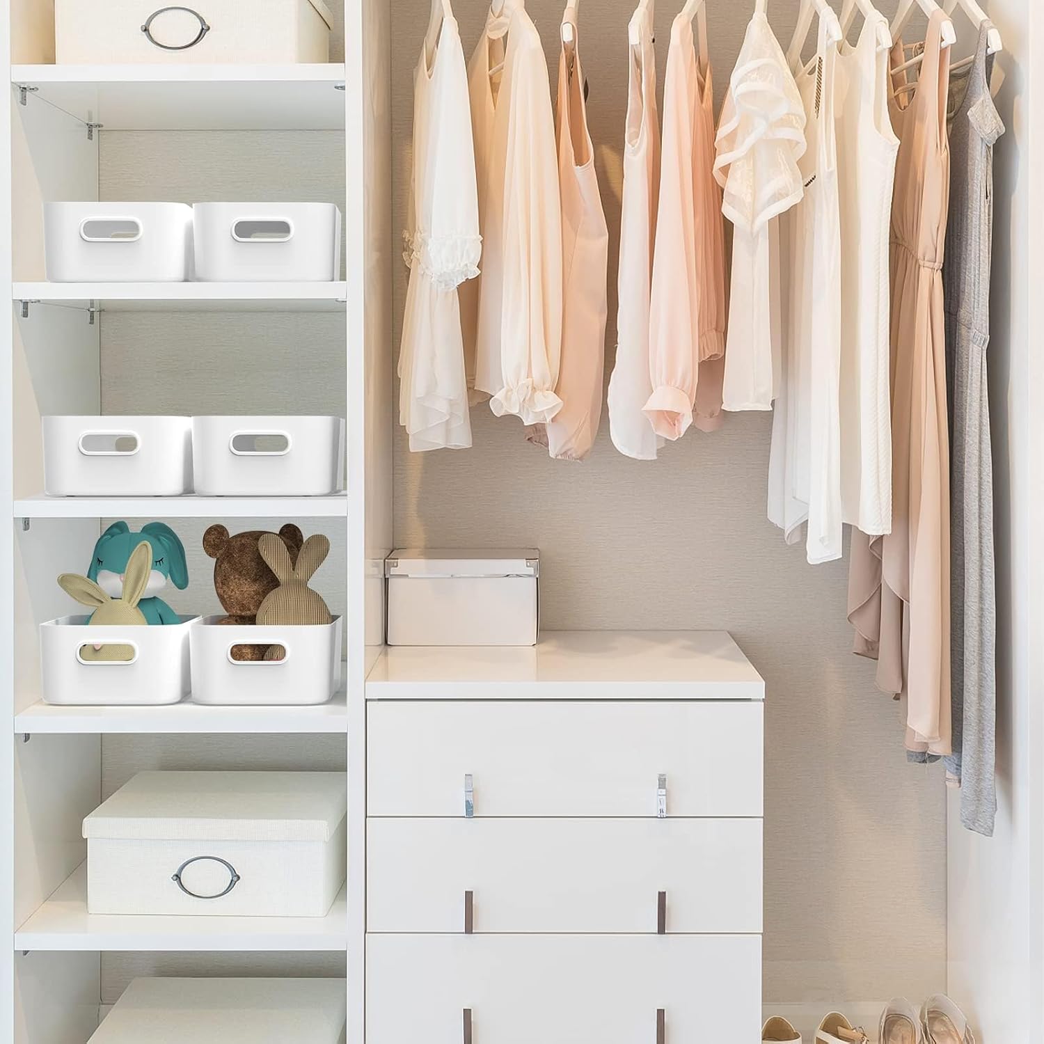 【5 White Medium Storage Boxes】You will get 5 plastic storage boxes measuring 25×17×10cm, each plastic box with built-in integrated handles on both sides so that they can be easily taken out of the shelf or out of the closet, and easy to carry.