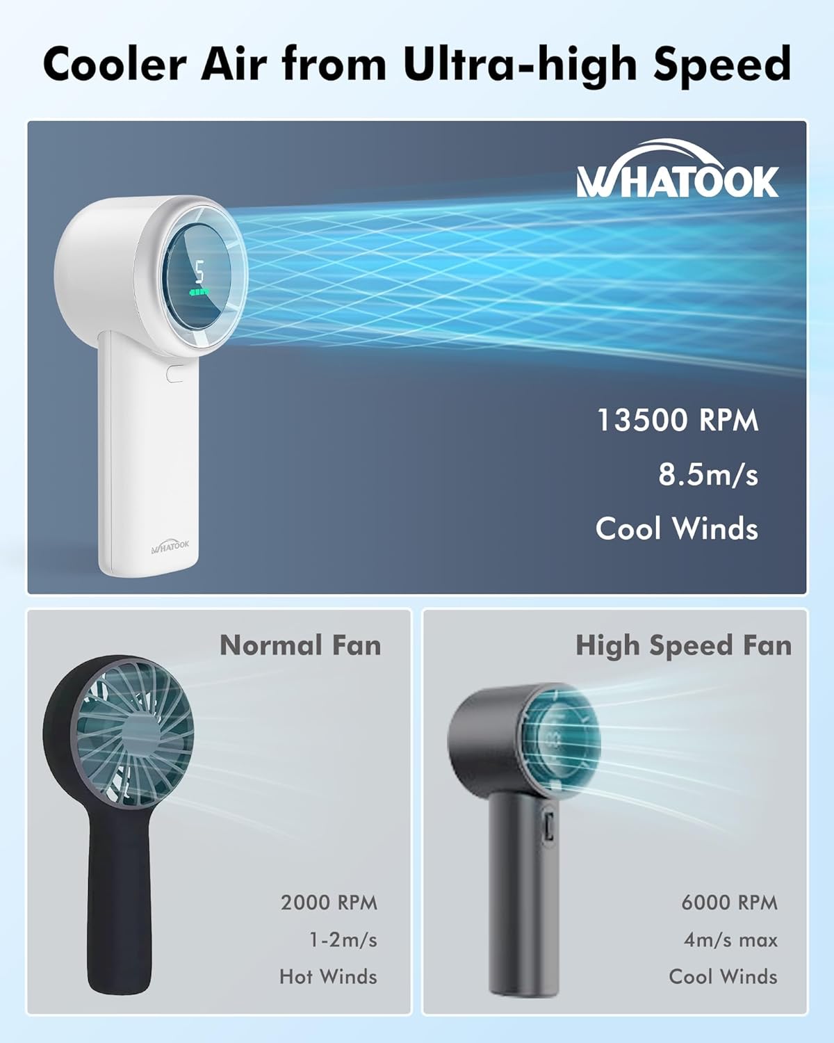 WHATOOK Handheld Fan, 2024 Powerful High Speed Cooling Turbo Mini Fan with LED Display, 5 Speeds USB Rechargeable Portable Fans, 2H Fast charging, Personal Small Stylish Travel Fan for Woman Outdoor