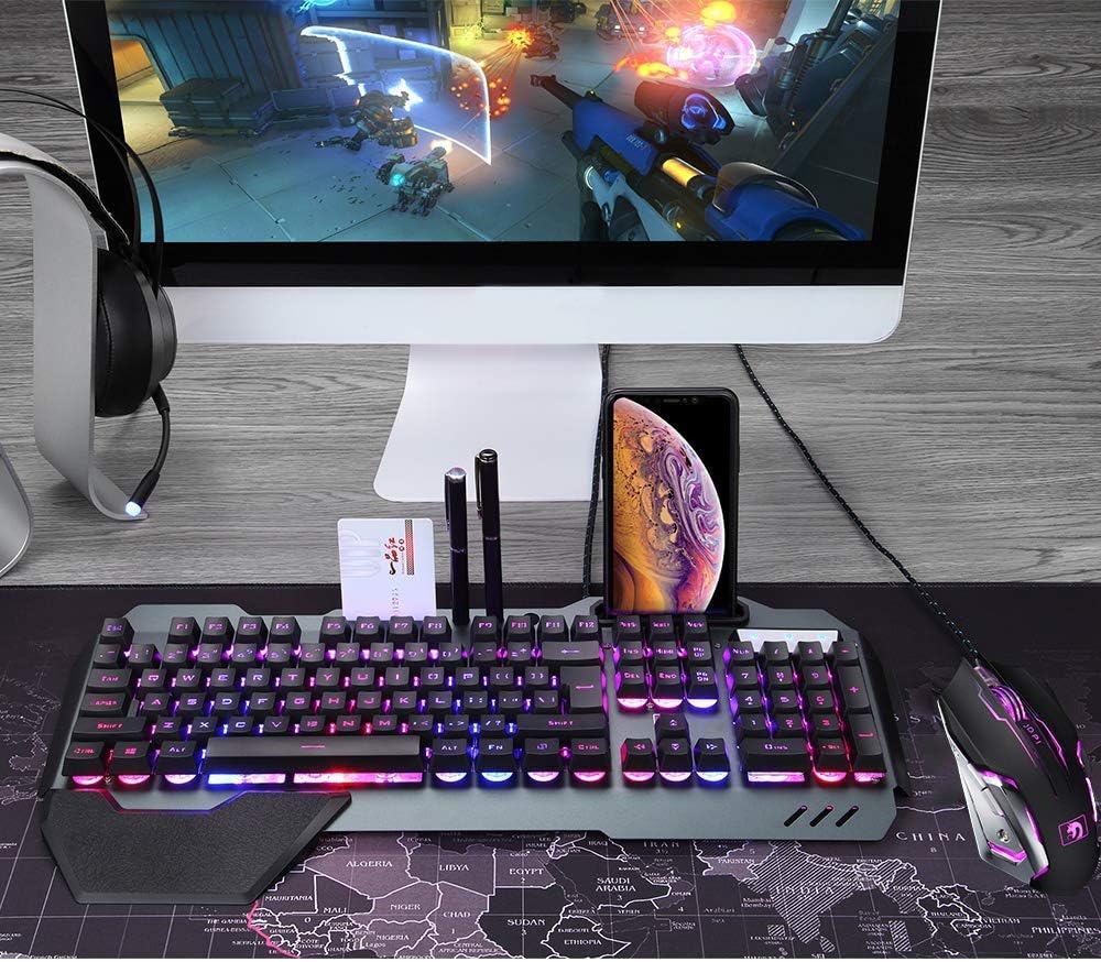 WIRED GAMING KEYBOARD MOUSE SET. The keyboard comes with a phone stand and lighter stand, it’s exclusive cooling wired gaming keyboard to offer the most comfortable gaming environment.