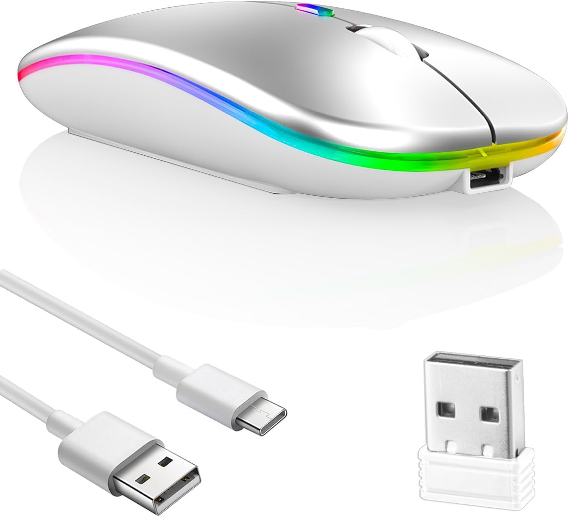 Wireless Bluetooth Mouse for Macbook Laptop Rechargeale Computer Mouse 2.4G Hz Bluetooth 5.2+USB A+USB C Dual Receivers Mice-1600DPI LED Quiet Click Office Mice for Windows Mac iPad Silver